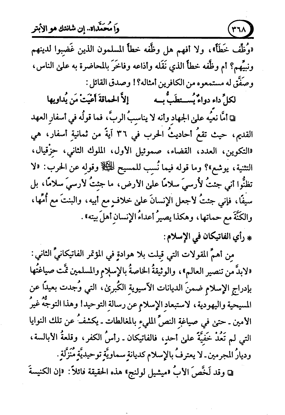 ° أمَّا نعيُه على الجهادِ وأنه لا يناسِبُ الربَّ، فما قولُه في أسفارِ العهد القديم، حيث تقعُ أحاديثُ الحرب في 36 آيةً من ثمانيةِ أسفار، هي "التكوين، العدد، القضاء، صموئيل الأول، الملوك الثاني، حِزْقيال، التثنية، يوشع"؟ وما قوله فيما نُسِب للمسيح -عليه السلام- وقولِه عن الحرب: "لا تظنُّوا أني جئتُ لأُرسيَ سلامًا على الأرض، ما جئِتُ لأُرسيَ سلامًا، بل سيفًا، فإني جئتُ لأجعل الإنسانَ على خلافٍ مع أبيه، والبنتَ مع أمِّها، والكَنَّةَ مع حماتها، وهكذا يصيرُ أعداءُ الإنسانِ أهلَ بيته".