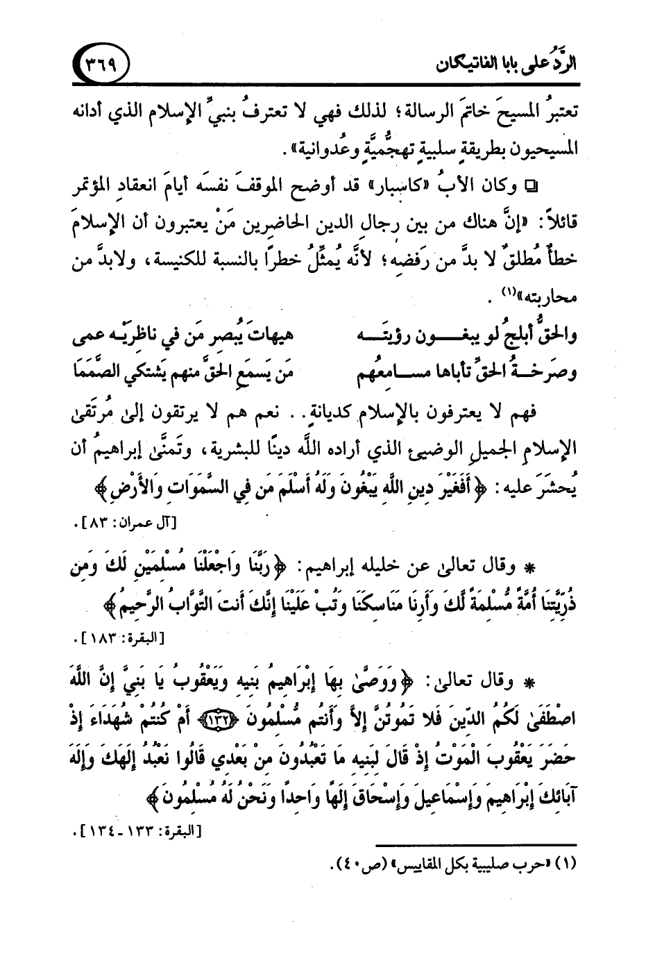 ° وكان الأبُ "كاسبار" قد أوضح الموقفَ نفسَه أيامَ انعقادِ المؤتمر قائلاً: "إن هناك من بين رجالِ الدين الحاضِرين مَنْ يعتبرون أن الإسلامَ خطأٌ مُطلق لا بدَّ من رَفضِه؛ لأنَّه يُمثِّل خطرًا بالنسبة للكنيسة، ولابدَّ من محاربته" (¬1).