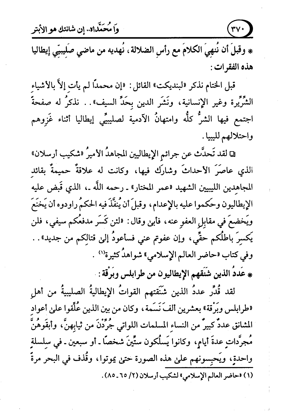° لقد تَحدَّث عن جرائمِ الإيطاليين المجاهدُ الأميرُ "شكيب أرسلان" الذي عاصَرَ الأحداثَ وشارَك فيها، وكانت له علاقةٌ حميمةٌ بقائدِ المجاهِدين الليبيين الشهيد "عمر المختار" -رحمه الله-، الذي قَبض عليه الإيطاليون وحَكموا عليه بالإعدام، وقبلَ أن يُنفَّذَ فيه الحكمُ راودوه أن يَخنَعَ ويَخضعَ في مقابِل العفوِ عنه، فأبى وقال: "لئن كَسَر مدفعُكم سيفي، فلن يَكسِرَ باطلُكم حقِّي، وإن عفوتم عني فسأعودُ إلى قتالِكم من جديد" .. وفي كتاب "حاضر العالم الإسلامي" شواهدُ كثيرة (¬1).