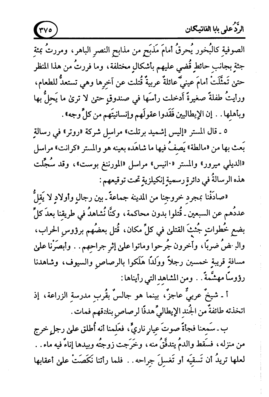 الصوفيةِ كالبُخور يُحرقُ أمامَ مَذبَحٍ من مذابح النصرِ الباهر، ومررتُ بمئةِ جثةٍ بجانبِ حائطٍ قُضي عليهم بأشكالٍ مختلفة، وما فررتُ من هذا المنظر حتى تَمثَّلَتْ أمامَ عيني عائلةٌ عربية قُتلت عن آخِرِها وهي تستعدُّ للطعام، ورأيتُ طفلةً صغيرةً أَدخلت رأسَها في صندوقٍ حتى لا ترى ما يَحِلُّ بها وبأهلِها .. إن الإيطاليين فَقَدوا عقولَهم وإنسانيتَهم من كلَّ وجه".