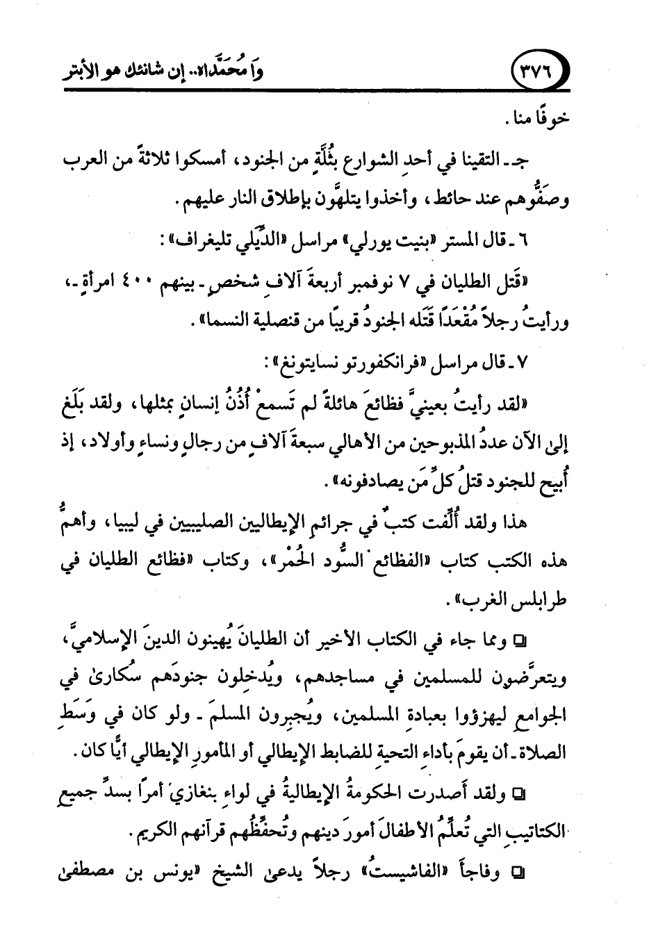 ° ولقد أَصدرت الحكومةُ الإيطاليةُ في لواءِ بنغازي أمرًا بسدِّ جميع الكتاتيبِ التي تُعلمُ الاطفالَ أمورَ دينهم وتُحفِّظُهم قرآنهم الكريم.