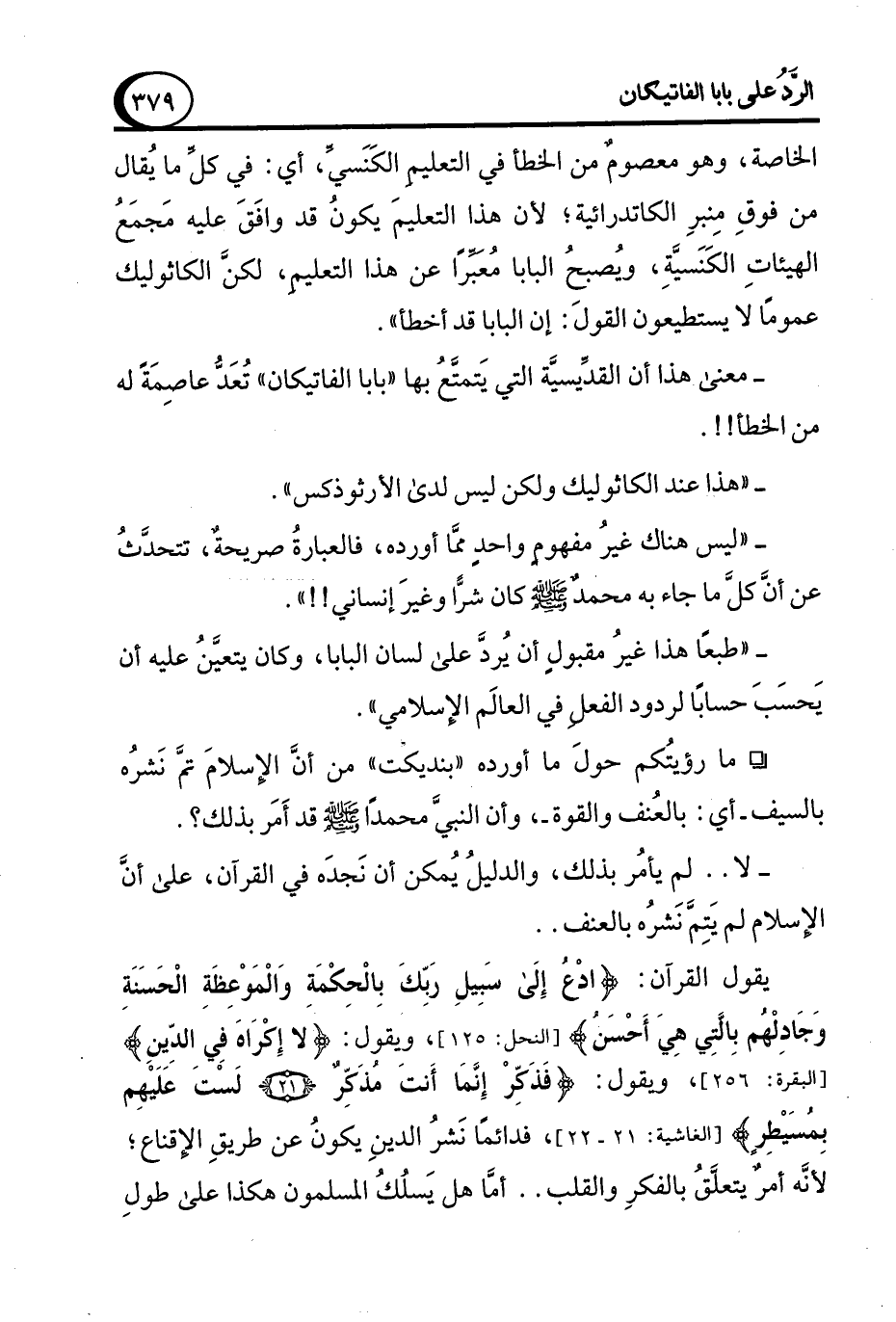 - "طبعًا هذا غيرُ مقبولٍ أن يُردَّ على لسان البابا، وكان يتعيَّنُ عليه أن يَحسَبَ حسابًا لردود الفعل في العالَم الإسلامي".