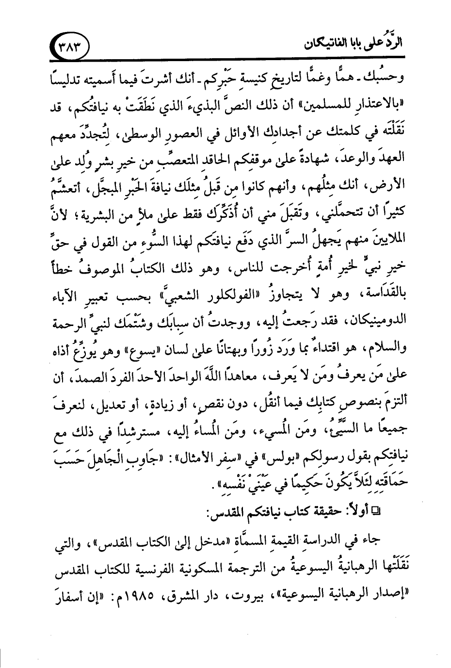 وحسُبك -همًّا وغمًّا لتاريخ كنيسةِ حَبْرِكم- أنك أشرتَ فيما أَسميته تدليسًا "بالاعتذارِ للمسلمين" أن ذلك النصَّ البذيءَ الذي نَطَقَتْ به نيافتُكم، قد نَقَلْتَه في كلمتك عن أجدادِك الأوائل في العصورِ الوسطى، لِتُجدِّدَ معهم العهدَ والوعدَ، شهادةً على موقفِكم الحاقدِ المتعصِّبِ من خيرِ بشرٍ وُلِد على الأرض، أنك مِثلُهم، وأنهم كانوا مِن قَبل مِثلَك نيافةَ الحَبْرِ المبجَّل، أتعشَّمُ كثيرًا أن تتحمَّلني، وتَقبَلَ مني أن أُذكِّرَك فقط على ملأٍ من البشرية؛ لأنَّ الملايينَ منهم يَجهلُ السرَّ الذي دَفَع نيافتَكم لهذا السُّوءِ من القول في حق خيرِ نبيٍّ لخيرِ أُمةٍ أُخرجت للناس، وهو ذلك الكتابُ الموصوفُ خطأً بالقَدَاسة، وهو لا يتجاوزُ "الفولكلور الشعبيَّ" بحسب تعبيرِ الآباء الدومينيكان، فقد رَجعتُ إليه، ووجدث أن سِبابَك وشَتْمَك لنبيِّ الرحمة والسلام، هو اقتداءٌ بما وَرَد زُورًا وبهتانًا على لسان "يسوع" وهو يُوزِّعُ أذاه على مَن يعرفُ ومَن لا يَعرف، معاهدًا اللهَ الواحدَ الأحدَ الفردَ الصمدَ، أن ألتزمَ بنصوصِ كتابِك فيما أنقُل، دون نقصٍ، أو زيادةٍ، أو تعديل، لنعرفَ جميعًا ما السَّيِّئُ، ومَن المُسيء، ومَن المُساءُ إليه، مسترشِدًا في ذلك معِ نيافتِكم بقول رسولِكم "بولس" في "سِفر الأمثال": "جَاوِبِ الْجَاهِلَ حَسَب حَمَاقَتِهِ لِئَلاَّ يَكُونَ حَكِيمًا في عَيْنَيْ نَفْسِهِ".
