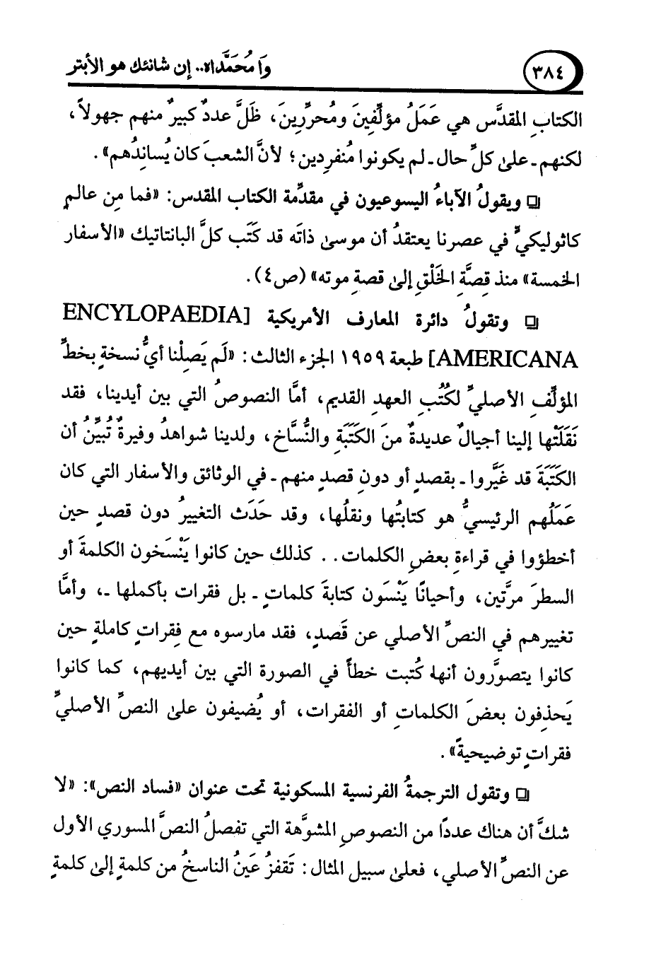 ° وتقولُ دائرة المعارف الأمريكية [ AMERICANA ENCYLOPAEDIA] طبعة 1959 الجزء الثالث: "لَم يَصِلْنا أيُّ نسخةٍ بخطِّ المؤلِّفِ الأصليِّ لكُتُبِ العهدِ القديم، أمَّا النصوصُ التي بين أيدينا، فقد نَقَلَتْها إلينا أجيالٌ عديدةٌ منَ الكَتَبَةِ والنُسَّاخ، ولدينا شواهدُ وفيرةٌ تُبيِّنُ أن الكَتَبَةَ قد غَيَّروا -بقصدٍ أو دونِ قصدٍ منهم- في الوثائق والأسفار التي كان عَمَلُهم الرئيسيُّ هو كتابتُها ونقلُها، وقد حَدَث التغييرُ دون قصدٍ حين أخطؤوا في قراءةِ بعضِ الكلمات .. كذلك حين كانوا يَنْسَخون الكلمةَ أو السطرَ مرَّتين، وأحيانًا يَنْسَون كتابةَ كلماتٍ -بل فقرات بأكملها-، وأمَّا تغييرهم في النصِّ الأصلي عن قَصدِ، فقد مارسوه مع فِقراتٍ كاملةٍ حين كانوا يتصوَّرون أنها كُتبت خطأً في الصورة التي بين أيديهم، كما كانوا يَحذِفون بعضَ الكلماتِ أو الفقرات، أو يُضيفون على النصِّ الأصليِّ فقراتٍ توضيحيةً".