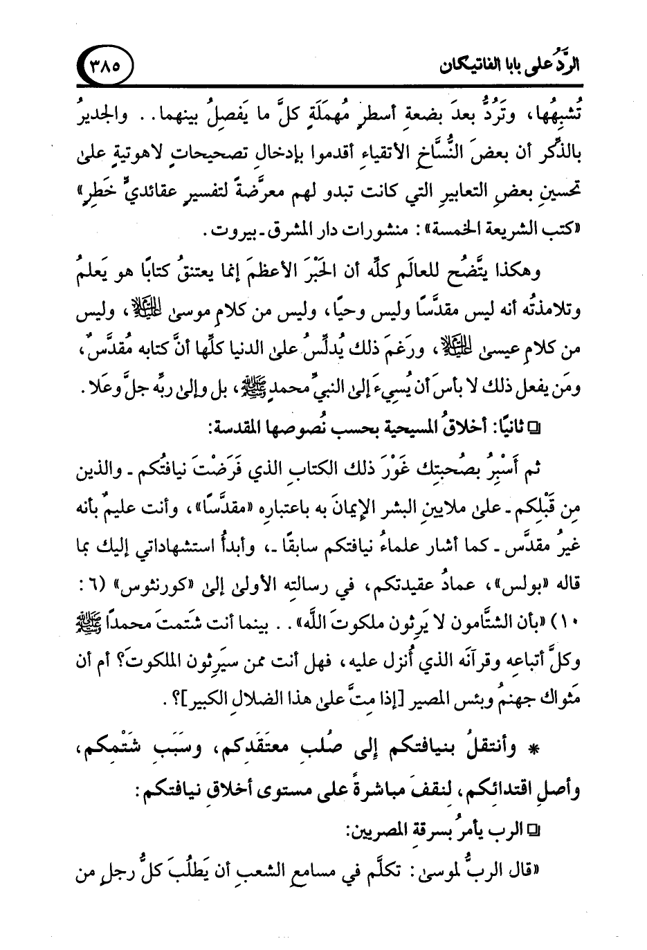 ثم أَسْبِرُ بصُحبتِك غَوْرَ ذلك الكتابِ الذي فَرَضْتَ نيافتُكم -والذين مِن قَبْلِكم- على ملايينِ البشر الإيمانَ به باعتبارِه "مقدَّسًا"، وأنت عليمٌ بأنه غيرُ مقدَّس -كما أشار علماءُ نيافتكم سابقًا-، وأبدأُ استشهاداتي إليك بما قاله "بولس"، عمادُ عقيدتكم، في رسالتِه الأولى إلى "كورنثوس" (6: 10) "بأن الشتَّامون لا يَرِثون ملكوتَ الله" .. بينما أنت شَتمتَ محمدًا - صلى الله عليه وسلم - وكلَّ أتباعِه وقرآنَه الذي أُنزل عليه، فهل أنت ممن سيَرِثون الملكوتَ؟ أم أن مَثواك جهنمُ وبئس المصير [إذا مِتَّ على هذا الضلالِ الكبير]؟.