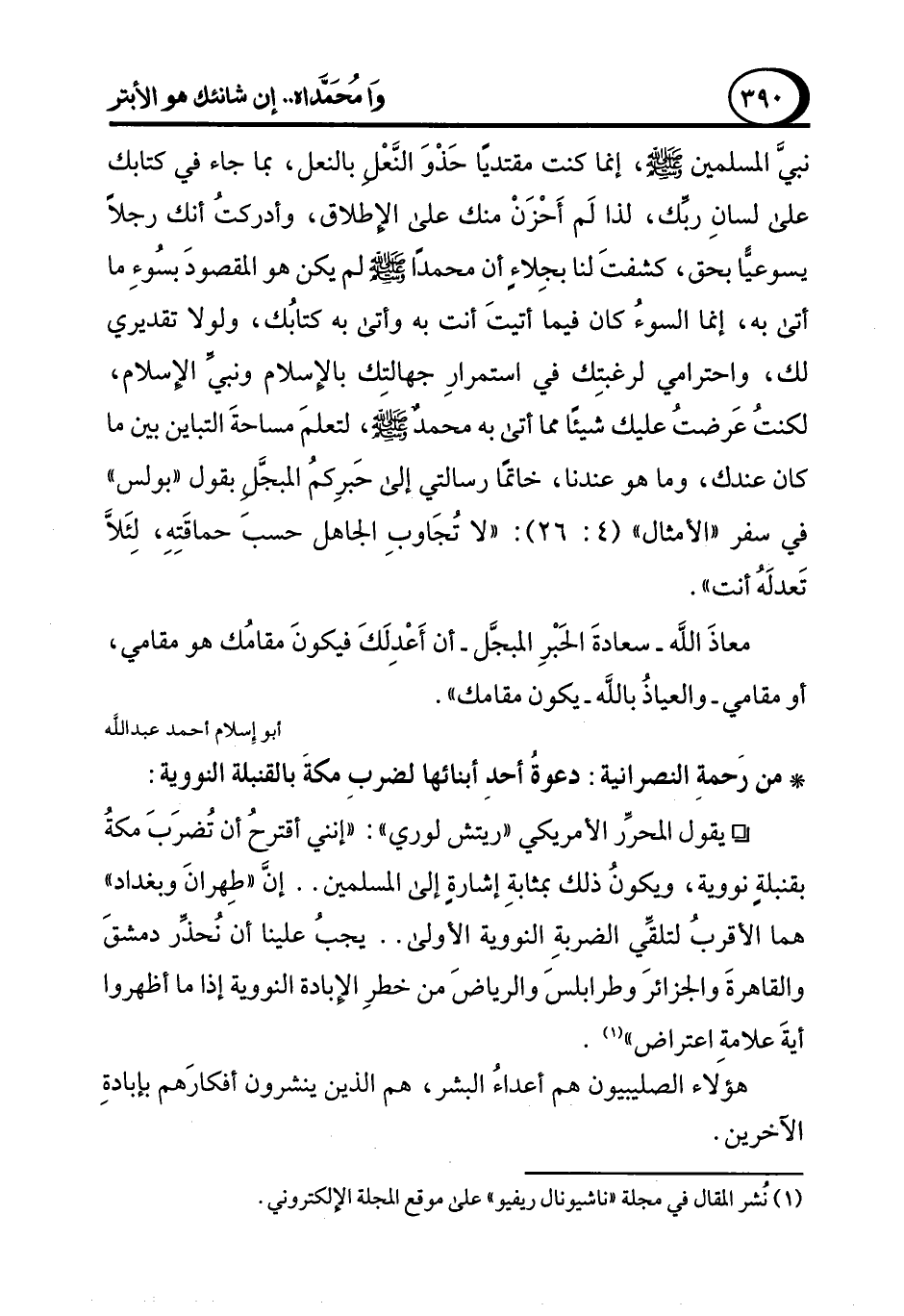 نبيَّ المسلمين - صلى الله عليه وسلم -، إنما كنت مقتديًا حَذْوَ النَّعْل بالنعل، بما جاء في كتابك على لسانِ ربِّك، لذا لَم أَحْزَنْ منك على الإطلاق، وأدركتُ أنك رجلاً يسوعيًّا بحق، كشفتَ لنا بجِلاءٍ أن محمدًا - صلى الله عليه وسلم - لم يكن هو المقصودَ بسُوءِ ما أتى به، إنما السوءُ كان فيما أتيتَ أنت به وأتى به كتابُك، ولولا تقديري لك، واحترامي لرغبتِك في استمرارِ جهالتِك بالإسلام ونبيِّ الإسلام، لكنتُ عَرضتُ عليك شيئًا مما أتى به محمد - صلى الله عليه وسلم -، لتعلمَ مساحةَ التباين بين ما كان عندك، وما هو عندنا، خاتمًا رسالتي إلى حَبرِكمُ المبجَّلِ بقول "بولس" في سفر "الأمثال" (4: 26): "لا تُجَاوبِ الجاهل حسب حماقَتِهِ، لِئَلاَّ تَعدلَهُ أنت".