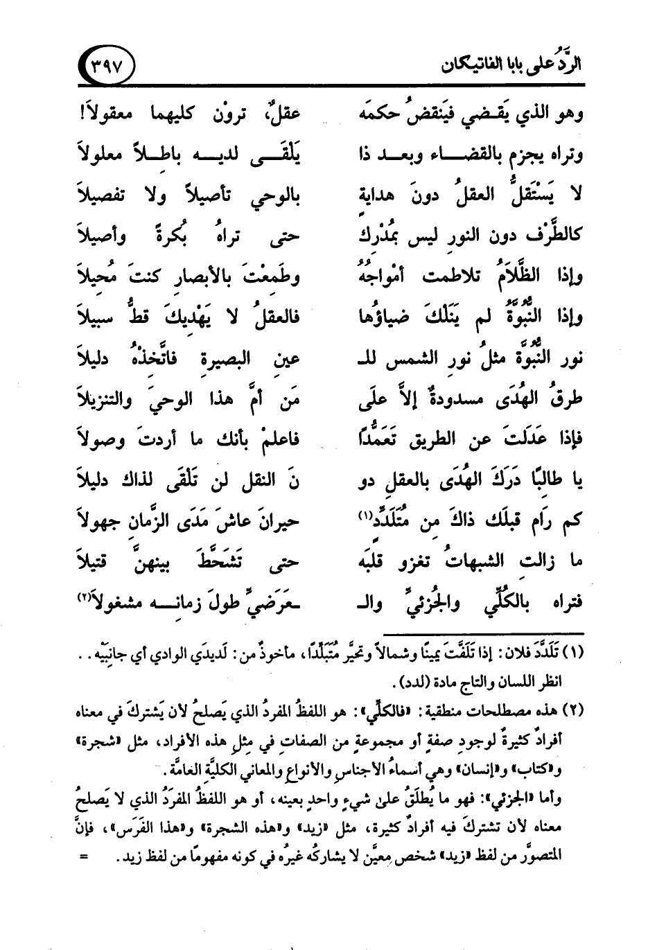 (¬2) هذه مصطلحات منطقية: "فالكلِّي": هو اللفظُ المفردُ الذي يَصلحُ لأن يَشتركَ في معناه أفرادٌ كثيرةٌ لوجودِ صفةٍ أو مجموعةٍ من الصفاتِ في مِثل هذه الأفراد، مثل "شجرة" و"كتاب" و"إنسان" وهي أسماءُ الأجناسِ والأنواعِ والمعاني الكليَّةِ العامَّة.