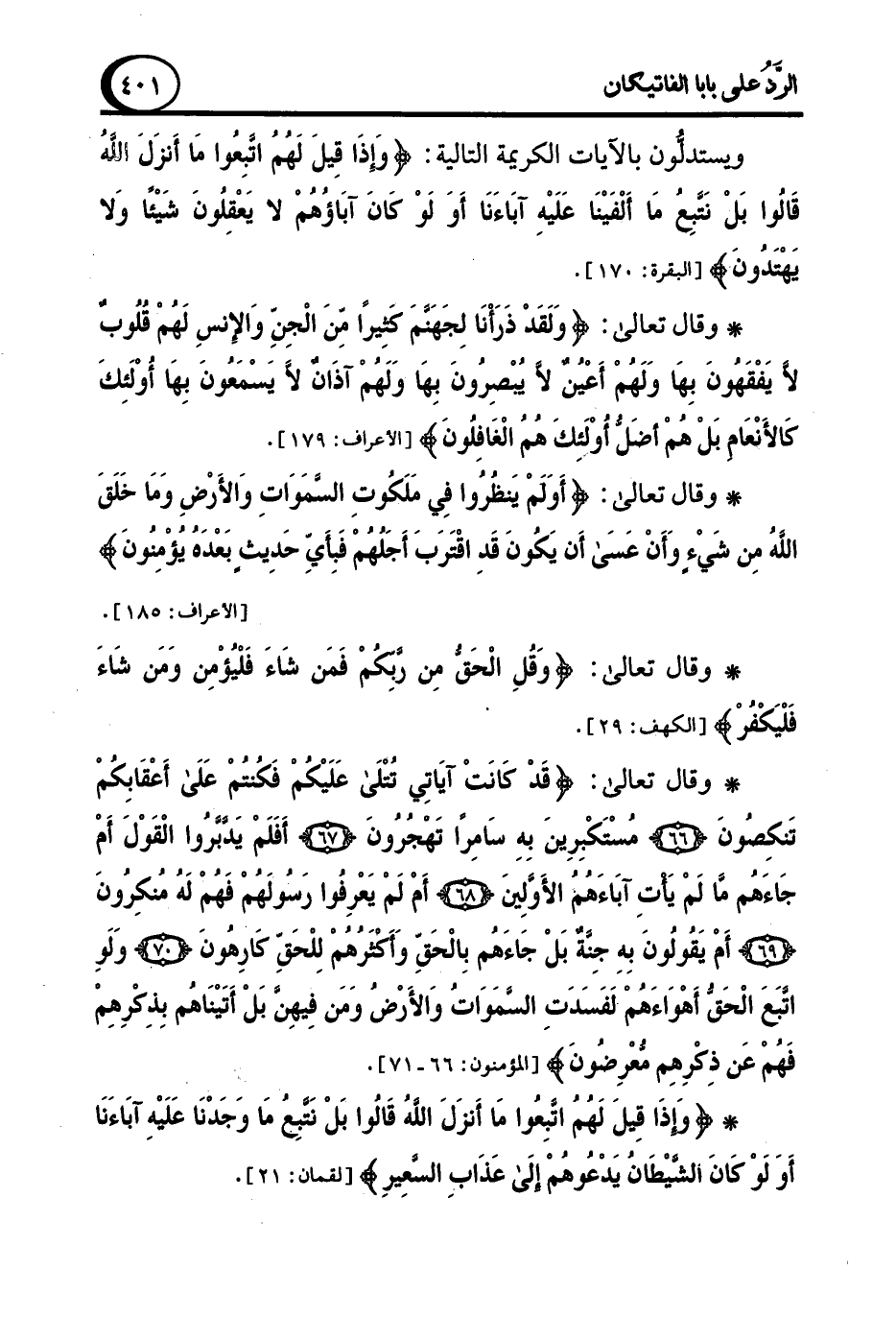 * {وَإِذَا قِيلَ لَهُمُ اتَّبِعُوا مَا أَنْزَلَ اللَّهُ قَالُوا بَلْ نَتَّبِعُ مَا وَجَدْنَا عَلَيْهِ آبَاءَنَا أَوَلَوْ كَانَ الشَّيْطَانُ يَدْعُوهُمْ إِلَى عَذَابِ السَّعِيرِ} [لقمان: 21].