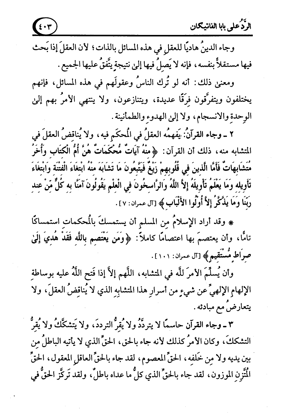 2 - وجاء القرآنُ: يَفهمُه العقلُ في المُحكَم فيه، ولا يُناقِضُ العقلَ في المتشابه منه، ذلك أن القرآن: {مِنْهُ آيَاتٌ مُحْكَمَاتٌ هُنَّ أُمُّ الْكِتَابِ وَأُخَرُ مُتَشَابِهَاتٌ فَأَمَّا الَّذِينَ فِي قُلُوبِهِمْ زَيْغٌ فَيَتَّبِعُونَ مَا تَشَابَهَ مِنْهُ ابْتِغَاءَ الْفِتْنَةِ وَابْتِغَاءَ تَأْوِيلِهِ وَمَا يَعْلَمُ تَأْوِيلَهُ إِلَّا اللَّهُ وَالرَّاسِخُونَ فِي الْعِلْمِ يَقُولُونَ آمَنَّا بِهِ كُلٌّ مِنْ عِنْدِ رَبِّنَا وَمَا يَذَّكَّرُ إِلَّا أُولُو الْأَلْبَابِ} [آل عمران: 7].