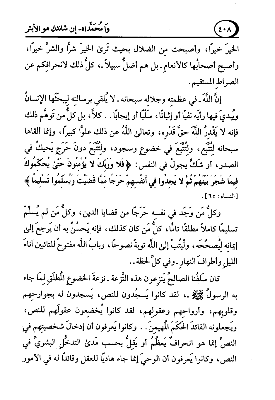 كان سَلفُنا الصالحُ يَنزِعون هذه النَّزعة -نزعةَ الخضوع المُطلَقِ لِمَا جاء به الرسولُ - صلى الله عليه وسلم -، لقد كانوا يَسجُدون للنص، يَسجدون له بجوارحِهم وقلوبِهم، وأرواحِهم وعقولِهم، لقد كانوا يُخضِعون عقولَهم للنص، ويَجعلونه القائدَ الحَكَمَ المُهيمِنَ .. وكانوا يَعرفون أن إدخالَ شخصيتِهم في النصِّ إنما هو انحرافٌ يَعظُمُ أو يَقِلُّ بحسب مَدى التدخُّلِ البشريِّ في النص، وكانوا يَعرفون أن الوحيَ إنما جاء هاديًا للعقل وقائدًا له في الأمور