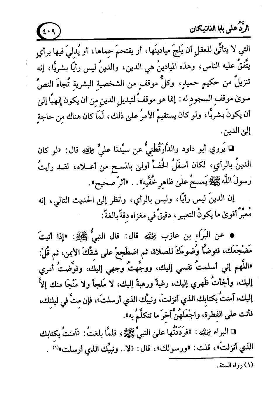 إن الدينَ ليس رأيًا، وليس بالرأي، وانظر إلى الحديث التالي، إنه مُعبِّرٌ أقوى ما يكونُ التعبير، دقيقٌ في مغزاه دِقةً بالغةً:
