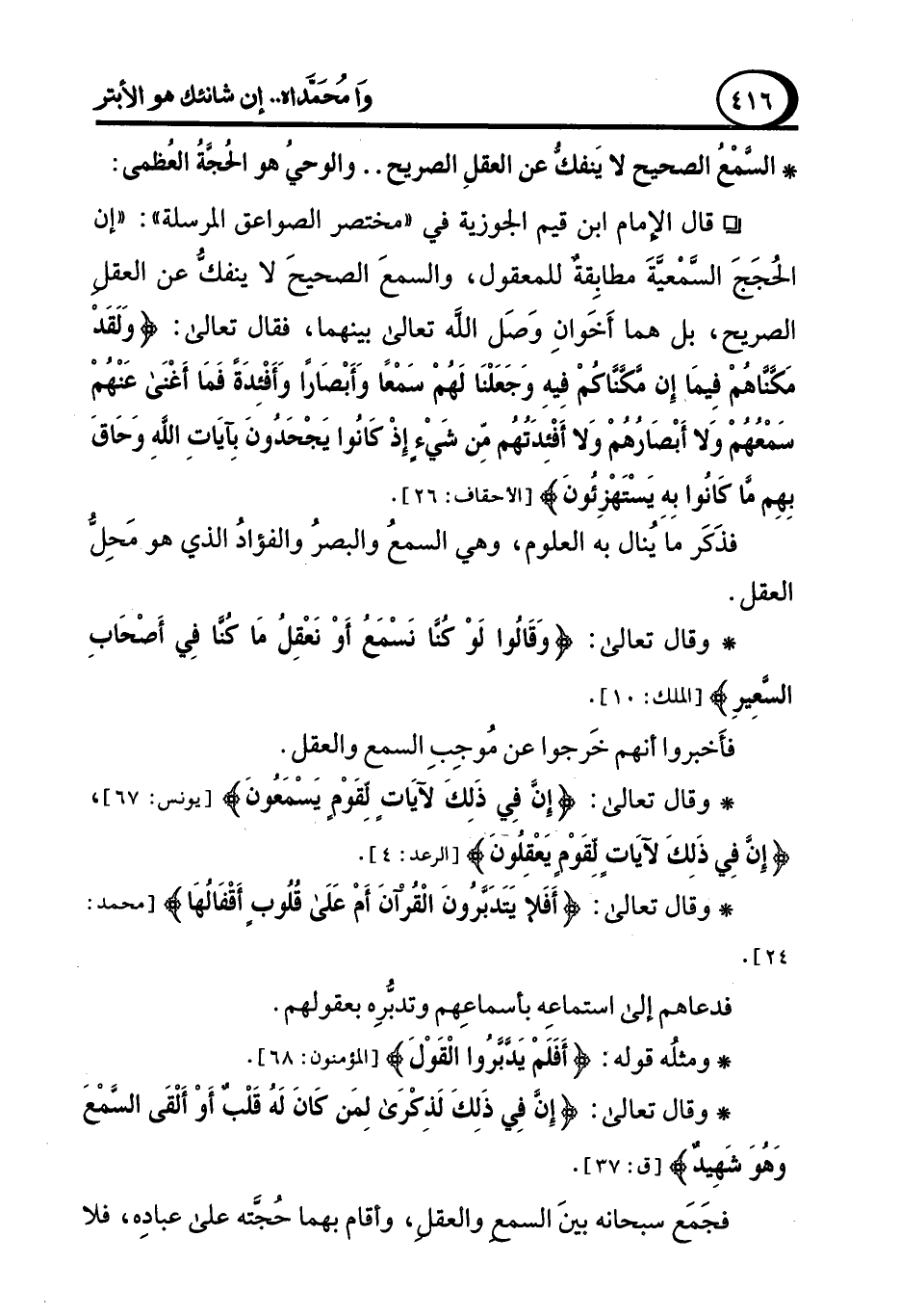 ° قال الإِمام ابن قيم الجوزية في "مختصر الصواعق المرسلة": "إن الحُجَجَ السَّمْعيَّةَ مطابِقةٌ للمعقول، والسمعَ الصحيحَ لا ينفكُّ عن العقل الصريح، بل هما أَخَوانِ وَصَل الله تعالى بينهما، فقال تعالى: {وَلَقَدْ مَكَّنَّاهُمْ فِيمَا إِنْ مَكَّنَّاكُمْ فِيهِ وَجَعَلْنَا لَهُمْ سَمْعًا وَأَبْصَارًا وَأَفْئِدَةً فَمَا أَغْنَى عَنْهُمْ سَمْعُهُمْ وَلَا أَبْصَارُهُمْ وَلَا أَفْئِدَتُهُمْ مِنْ شَيْءٍ إِذْ كَانُوا يَجْحَدُونَ بِآيَاتِ اللَّهِ وَحَاقَ بِهِمْ مَا كَانُوا بِهِ يَسْتَهْزِئُونَ (26)} [الأحقاف: 26].