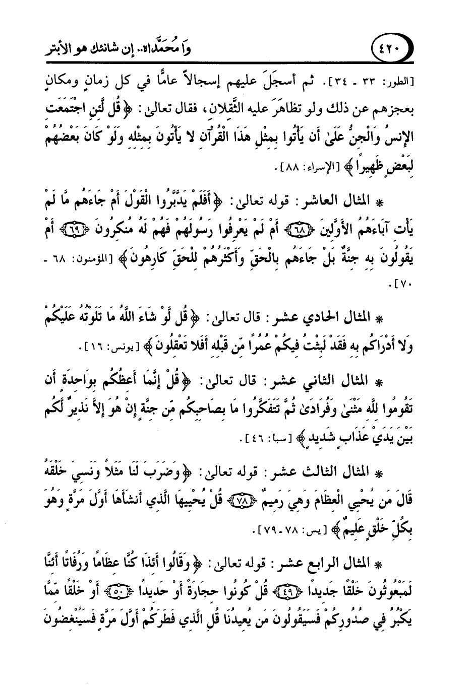 [الطور: 33 - 34]. ثم أسجَلَ عليهم إسجالاً عامًّا في كل زمانٍ ومكانٍ بعجزهم عن ذلك ولو تظاهَرَ عليه الثَّقِلانِ، فقال تعالى: {قُلْ لَئِنِ اجْتَمَعَتِ الْإِنْسُ وَالْجِنُّ عَلَى أَنْ يَأْتُوا بِمِثْلِ هَذَا الْقُرْآنِ لَا يَأْتُونَ بِمِثْلِهِ وَلَوْ كَانَ بَعْضُهُمْ لِبَعْضٍ ظَهِيرًا} [الإسراء: 88].