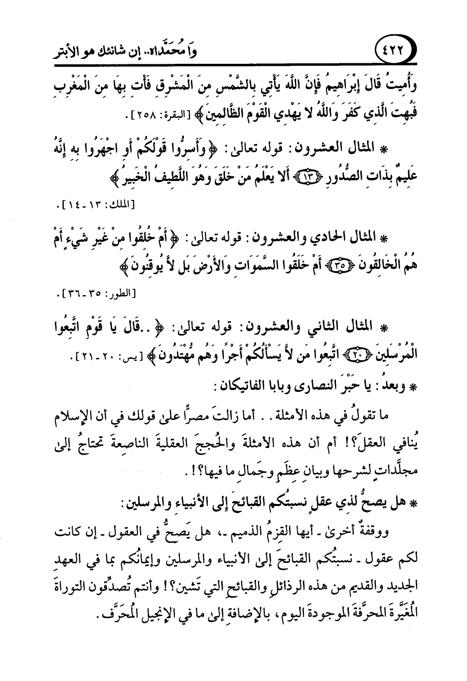 ووقفةٌ أخرى -أيها القِزمُ الذميم-، هل يَصحُّ في العقول -إن كانت لكم عقول- نسبتُكم القبائحَ إلى الأنبياء والمرسلين وإيمانُكم بما في العهدِ الجديد والقديم من هذه الرذائل والقبائح التي تَشين؟! وأنتم تُصدِّقون التوراةَ المُغَيَّرةَ المحرَّفةَ الموجودةَ اليوم، بالإضافةِ إلى ما في الإنجيل المُحَرَّف.