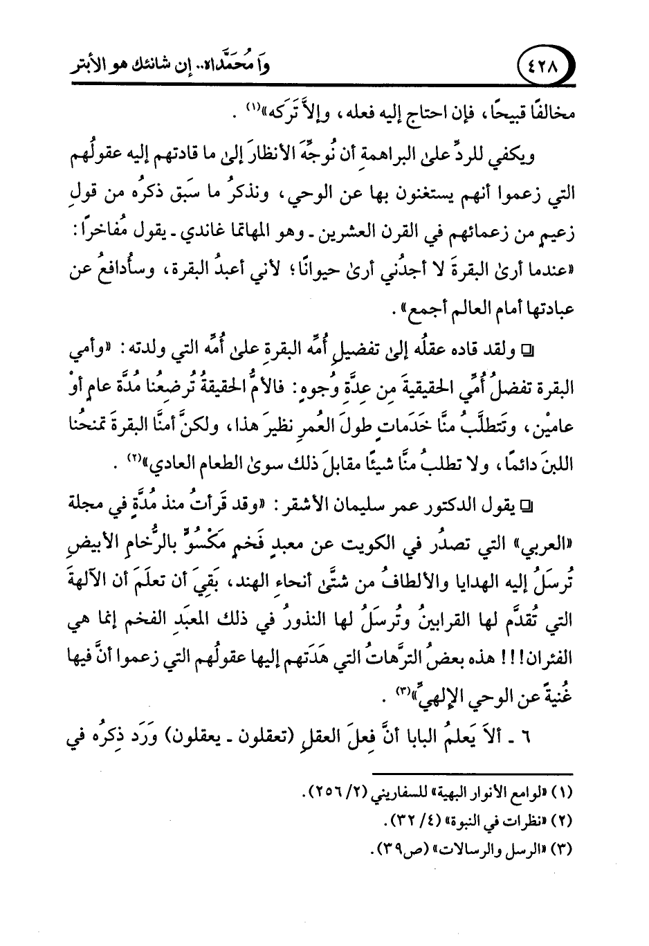 ° يقول الدكتور عمر سليمان الأشقر: "وقد قَرأتُ منذ مُدَّةٍ في مجلة "العربي" التي تصدُر في الكويت عن معبدٍ فَخمٍ مَكْسُوٍّ بالرُّخامِ الأبيضِ تُرسَلُ إليه الهدايا والألطافُ من شتَّى أنحاءِ الهند، بَقِيَ أن تعلَمَ أن الآلهةَ التي تُقدَّم لها القرابينُ وتُرسَلُ لها النذورُ في ذلك المعبَدِ الفخم إنما هي الفئران!!! هذه بعضُ الترَّهاتُ التي هَدَتهم إليها عقولُهم التي زعموا أنَّ فيها غُنيةً عن الوحي الإلهيِّ" (¬3).