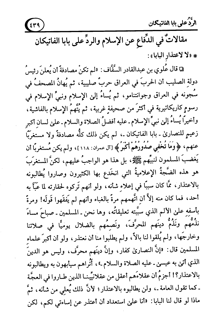 ° قال عُلوي بن عبد القادر السَّقَّاف: "لم تكنْ مصادفةً أن يُعلنَ رئيسُ دولةِ الصليب أن الحربَ في العراق حربٌ صليبية، ثم يُهانُ المصحفُ في سُجونه في العراق وجوانتنامو، ثم يُساءُ إلى الإسلام ونبيِّ الإسلام في رسومٍ كاريكاتيرية في أكثرَ من صحيفةٍ غربية، ثم يُتَّهمُ الإسلام بالفاشية، وأخيرًا يُساءُ إلى نبيِّ الإسلام -عليه أفضلُ الصلاة والسلام- على لسانِ أكبرِ زعيمٍ للنصارى -بابا الفاتيكان-، لم يكن ذلك كلُّه مصادفةً ولا مستغرَبًا عنهم، {وَمَا تُخْفِي صُدُورُهُمْ أَكْبَرُ} [آل عمران: 118]، ولم يكن مُستغربًا أن يَغضبَ المسلمون لنبيِّهم - صلى الله عليه وسلم -، بل هذا هو الواجب عليهم، لكنَّ المستغرَبَ هو هذه الضَّجةُ الإعلاميةُ التي انخَدع بها الكثيرون وصاروا يُطالبونه بالاعتذار، ممَّا كان سببًا في إعلاءِ شأنه، ولو أنهم تَركوه لحقارته لما عَبَأَ به أحد، فما كان منه إلاَّ أنِ اتَهمهم مرةً بالغباء وأنهم لم يَفقَهوا قَولَه! ومرةً بأسفِهِ على الألم الذي سبَّبته تعليقاتُه، وها نحن -المسلمين- صباحَ مساءَ نذُمُّهم ونَذُمُّ دينَهم المحرَّفَ، ونَصِمُهم بالضلال يوميًّا في صلاتنا وخارجَها، ولم يُلقوا لنا بالاً، ولم يطلبوا منا أن نعتذر، ولو أن أكبرَ علماءٍ المسلمين قال: "إنَّ النصارى كفار، وإنَّ دينَهم محرَّف، وليس هو الدين الذي أتى به عيسى -عليه الصلاة والسلام-"، أَتُراهم سيأبهون به ويطالبونه بالاعتذار؟! أجزمُ أن عقلاءَهم أعقل من عقلانِّيينا الذين طاروا في العجَّة -كما تقول العامة-، ولن يطالبوه بالاعتذار؛ لأنَّ ذلك يُعلِي من شأنه، ثُمَّ ماذا لو قال لنا البابا: "أنا على استعداد أن أعتذر عن إساءتي لكم، لكن