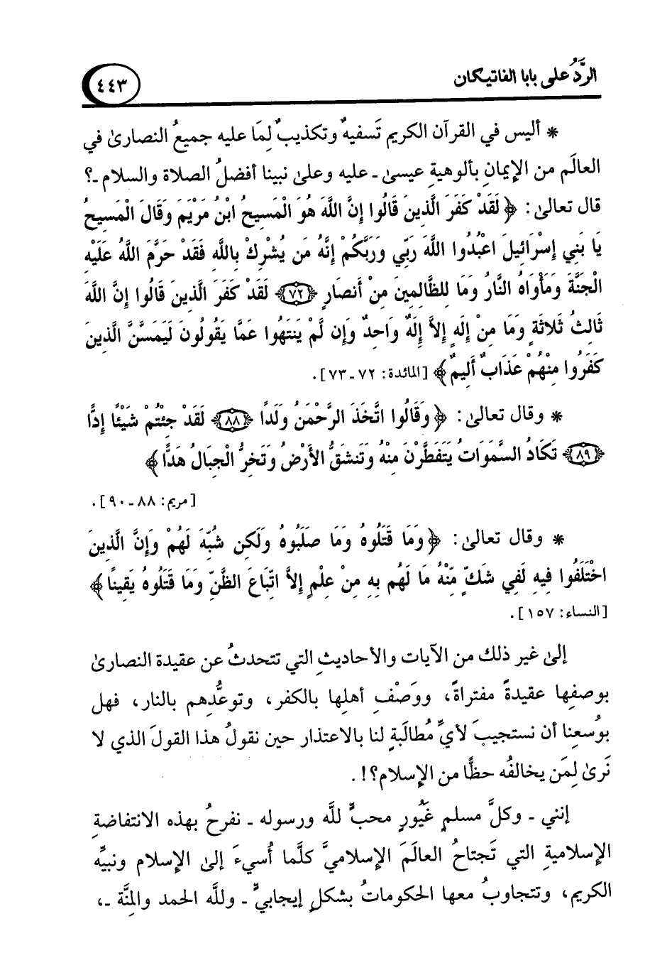 إلى غير ذلك من الآيات والأحاديثِ التي تتحدثُ عن عقيدة النصارى بوصفِها عقيدةً مفتراةً، ووَصْفِ أهلِها بالكفر، وتوعُّدِهم بالنار، فهل بوُسعِنا أن نستجيب لأيِّ مُطالَبةٍ لنا بالاعتذار حين نقولُ هذا القولَ الذي لا نَرى لِمَن يخالفُه حظًّا من الإسلام؟!.