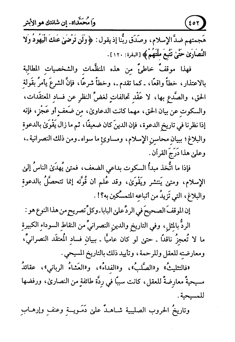 فهذا موقفٌ خاطئٌ مِن هذه المنظَّماتِ والشخصياتِ المطالِبة بالاعتذار، خطأً واقعًا، -كما تقدم-، وخطأً شرعًا، فإنَّ الشرعَ يأمرُ بقَولةِ الحق، والصَّدع بها، لا عَقْدِ تحالفاتٍ لغضِّ النظرِ عن فسادِ المعتقَدات، والسكوتِ عن بيان الحق، مهما كانت الدعاوى، مِن ضَعفٍ أو عَجْزٍ، فإنه إذا نظرنا في تاريخِ الدعوة، فإن الدينَ كان ضعيفًا، ثم ما زال يَقْوَى بالدعوةِ والبلاغ؛ ببيانِ محاسِنِ الإسلام، ومساوئِ ما سواه -ومن ذلك النصرانية-، وعلى هذا دَرَجَ القرآن.