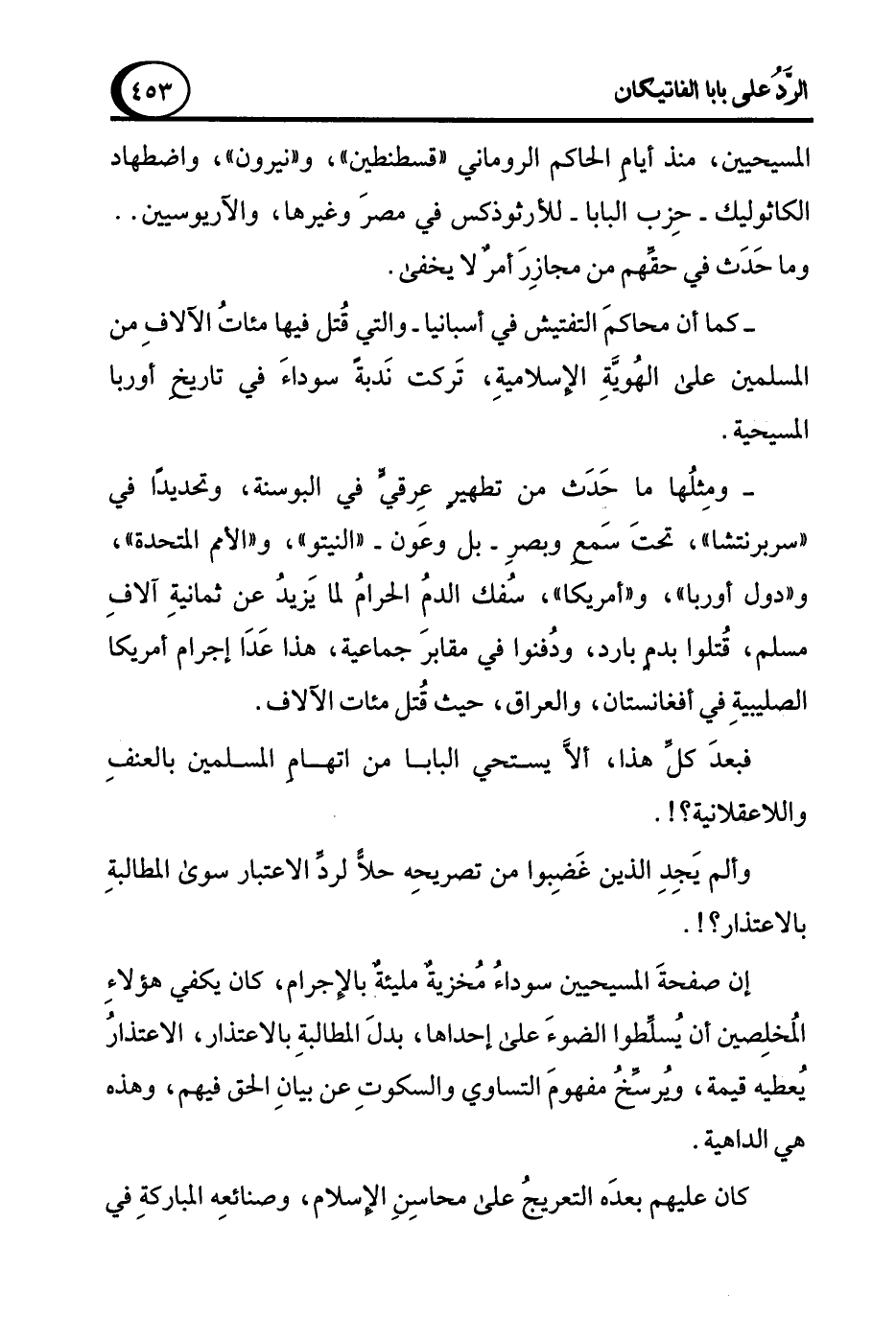 إن صفحةَ المسيحيين سوداءُ مُخزيةٌ مليئةٌ بالإجرام، كان يكفي هؤلاءِ المُخلِصين أن يُسلِّطوا الضوءَ على إحداها، بدلَ المطالبةِ بالاعتذار، الاعتذارُ يُعطيه قيمة، ويُرسَّخُ مفهومَ التساوي والسكوتِ عن بيانِ الحق فيهم، وهذه هي الداهية.