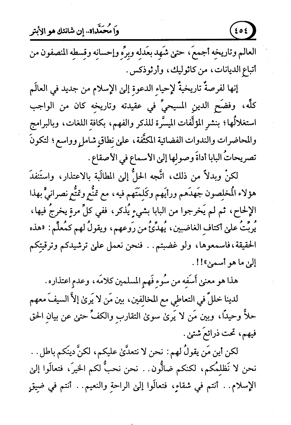 إنها لفرصةٌ تاريخيةٌ لإحياءِ الدعوةِ إلى الإسلام من جديد في العالَم كلِّه، وفضَحِ الدينِ المسيحيِّ في عقيدته وتاريخِه كان من الواجب استغلالُها؛ بنشرِ المؤلَّفات الميسَّرة للذكر والفهم، بكافةِ اللغات، وبالبرامج والمحاضرات والندوات الفضائية المكثَّفة، على نِطاقٍ شاملٍ وواسع؛ لتكونَ تصريحاتُ البابا أداةَ وصولِها إلى الأسماع في الأصقاع.