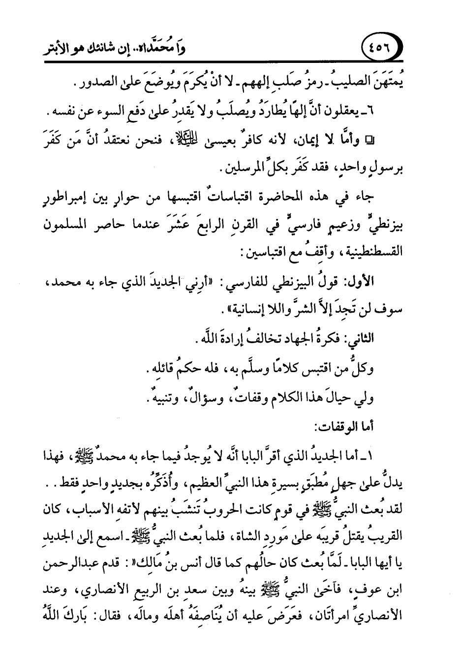 الأول: قول البيزنطي للفارسي: "أرِني الجديدَ الذي جاء به محمد، سوف لن تَجِدَ إلاَّ الشرَّ واللاإنسانية".