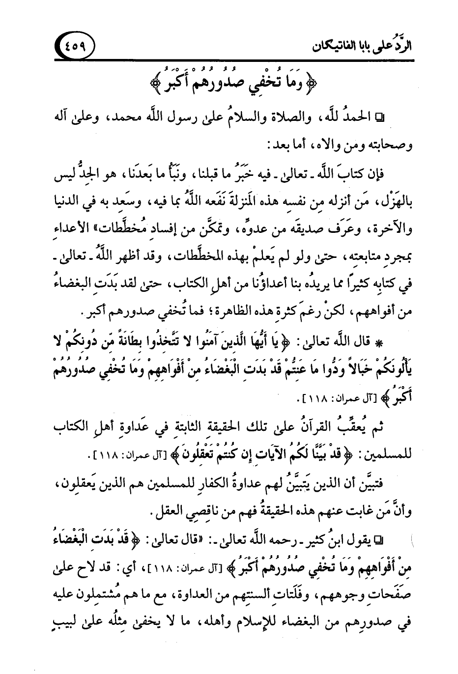 ° يقول ابنُ كثير -رحمه الله تعالى-: "قال تعالى: {قَدْ بَدَتِ الْبَغْضَاءُ مِنْ أَفْوَاهِهِمْ وَمَا تُخْفِي صُدُورُهُمْ أَكْبَرُ} [آل عمران: 118]، أي: قد لاح على صَفَحاتِ وجوههم، وفَلَتاتِ ألسنتِهم من العداوة، مع ما هم مُشتمِلون عليه في صدورِهم من البغضاء للإسلام وأهله، ما لا يخفى مِثلُه على لبيبٍ