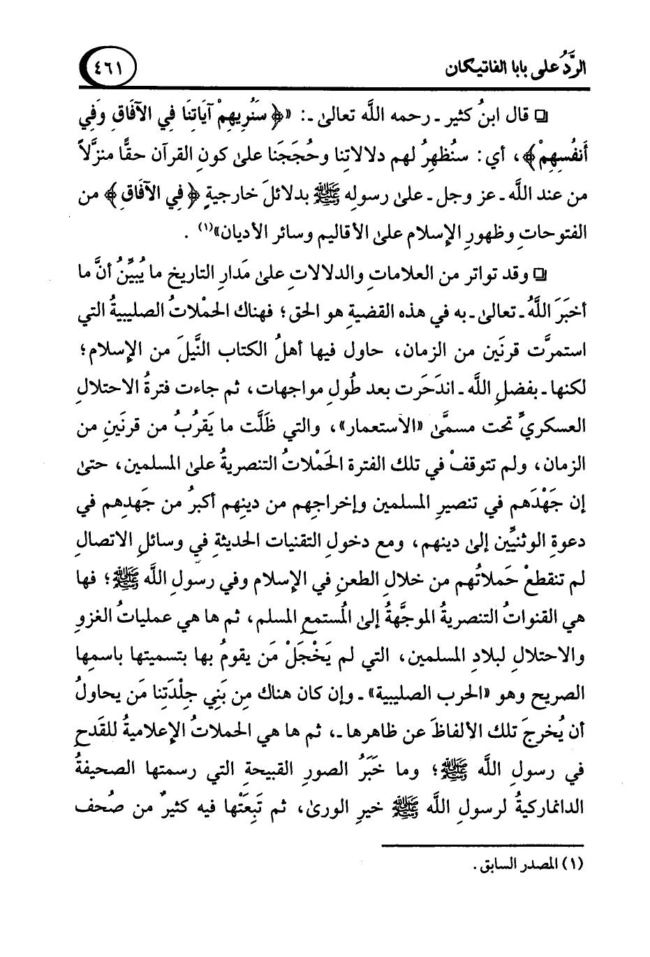 ° وقد تواتر من العلاماتِ والدلالاتِ على مَدارِ التاريخ ما يُبيِّنُ أنَّ ما أخبَرَ اللهُ -تعالى- به في هذه القضيةِ هو الحق؛ فهناك الحمْلاتُ الصليبيةُ التي استمرَّت قرنَين من الزمان، حاول فيها أهلُ الكتاب النَّيلَ من الإسلام؛ لكنها -بفضل الله- اندَحَرت بعد طُولِ مواجهات، ثم جاءت فترةُ الاحتلالِ العسكريَّ تحت مسمَّى "الاستعمار"، والتي ظَلَّت ما يَقرُبُ من قرنَينِ من الزمان، ولم تتوقفْ في تلك الفترة الحَمْلاتُ التنصيريةُ على المسلمين، حتى إن جَهْدَهم في تنصيرِ المسلمين وإخراجِهم من دينِهم أكبرُ من جَهدِهم في دعوةِ الوثنيين إلى دينهم، ومع دخولِ التقنيات الحديثةِ في وسائل الاتصالِ لم تنقطعْ حَملاتُهم من خلالِ الطعنِ في الإسلام وفي رسولِ الله - صلى الله عليه وسلم - فها هي القنواتُ التنصيريةُ الموجَّهةُ إلى المُستمع المسلم، ثم ها هي عملياتُ الغزوِ والاحتلالِ لبلادِ المسلمين، التي لم يَخْجَلْ مَن يقومُ بها بتسميتها باسمِها الصريح وهو "الحرب الصليبية" -وإن كان هناك مِن بنِي جِلْدَتِنا مَن يحاولُ أن يُخرجَ تلك الألفاظَ عن ظاهرها-، ثم ها هي الحملاتُ الإعلاميةُ للقَدحِ في رسولِ الله - صلى الله عليه وسلم - وما خَبَرُ الصورِ القبيحةِ التي رسمتها الصحيفةُ الدانماركيةُ لرسولِ الله - صلى الله عليه وسلم - خيرِ الورى، ثم تَبِعَتْها فيه كثيرٌ من صُحف