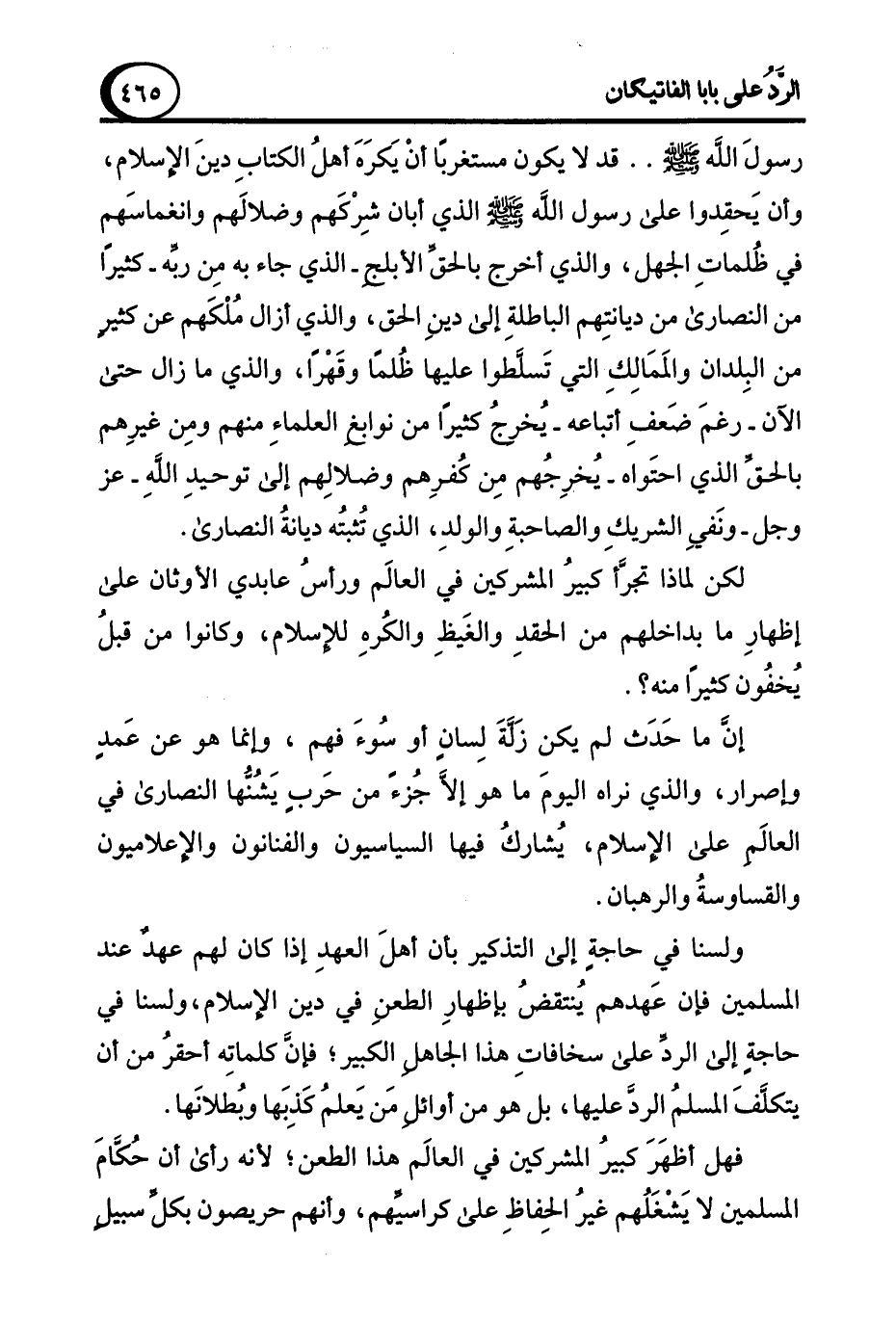 ولسنا في حاجةٍ إلى التذكير بأن أهلَ العهدِ إذا كان لهم عهد عند المسلمين فإن عَهدهم يُنتقضُ بإظهارِ الطعنِ في دين الإسلام، ولسنا في حاجةٍ إلى الرد على سخافاتِ هذا الجاهل الكبير؛ فإن كلماتِه أحقرُ من أن يتكلَّفَ المسلمُ الردَّ عليها، بل هو من أوائل مَن يَعلمُ كَذِبَها وبُطلانَها.