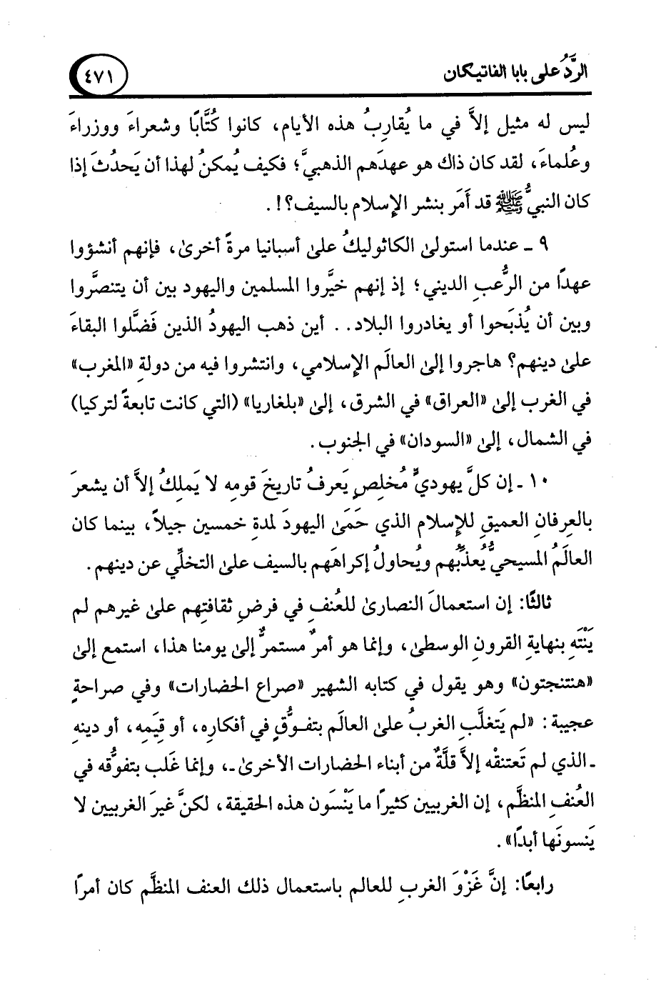 10 - إن كل يهوديٍّ مُخلِصٍ يَعرفُ تاريخَ قومِه لا يَملِكُ إلاَّ أن يشعرَ بالعِرفانِ العميقِ للإسلام الذي حَمَى اليهودَ لمدةِ خمسين جيلاً، بينما كان العالَمُ المسيحيُّ يُعذِّبُهم ويُحاولُ إكراهَهم بالسيف على التخلِّي عن دينهم.