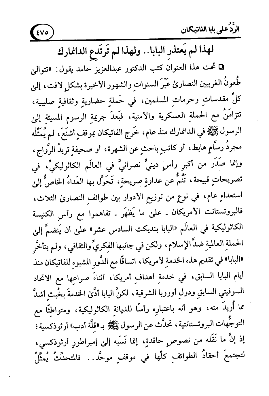 ° تحت هذا العنوان كتب الدكتور عبد العزيز حامد يقول: "تتوالى طُعونُ الغربيين النصارى عَبْرَ السنواتِ والشهور الأخيرة بشكل لافت، إلى كلِّ مقدساتِ وحرماتِ المسلمين، في حَملةٍ حضاريةٍ وثقافيةٍ صليبية، تتزامَنُ مع الحملةِ العسكرية والأمنية، فبَعدَ جريمةِ الرسوم المسيئةِ إلى الرسول - صلى الله عليه وسلم - في الدانمارك منذ عام، خَرج الفاتيكان بموقفٍ أشنَعَ، لم يُمَثِّلْه مجردُ رسَّامٍ هابط، أو كاتبٍ باحثٍ عن الشهرة، أو صحيفةٍ تريدُ الرَّواج، وإنما صَدَر من أكبرِ رأسٍ ديني نصرانيٍّ في العالَم الكاثوليكيِّ، في تصريحاتٍ قبيحة، تَنُمُّ عن عداوةٍ صريحةٍ، تَحَوَّل بها العَداءُ الخاصُّ إلى استعداءٍ عام، في نوعٍ من توزيع الأدوار بين طوائفِ النصارى الثلاث، فالبروتستانت الأمريكان -على ما يَظهَر- تفاهموا مع رأسِ الكنيسة الكاثوليكية في العالَم "البابا بنديكت السادس عشر" على أن يَنضمَّ إلى الحملةِ العالميةِ ضدَّ الإسلام، ولكن في جانبها الفِكريِّ والثقافي، ولم يتأخَّرِ "البابا" في تقديم هذه الخدمةِ لأمريكا، اتساقًا مع الدَّورِ المشبوهِ للفاتيكان منذ أيام البابا السابق، في خدمةِ أهدافِ أمريكا، أثناءَ صراعِها مع الاتحاد السوفيتي السابقِ ودولِ أوروبا الشرقية، لكن البابا أدَّى الخدمةَ بخُبثٍ أشدَّ مما أُريدَ منه، وهو أنه باعتبارِه رأسًا للديانةِ الكاثوليكية، ومتواطِئًا مع التوجُّهات البروتستانتية، تحدَّث عن الرسول - صلى الله عليه وسلم - بـ "قِلَّة أدب" أرثوذكسي, إذ إنَّ ما نَقَله من نصوصٍ حاقدةٍ، إنما نَسَبه إلى إمبراطورٍ أرثوذكسي، لتجتمعَ أحقادُ الطوائفِ كلَّها في موقفٍ موحَّد .. فالمتحدَّثُ يُمثِّل