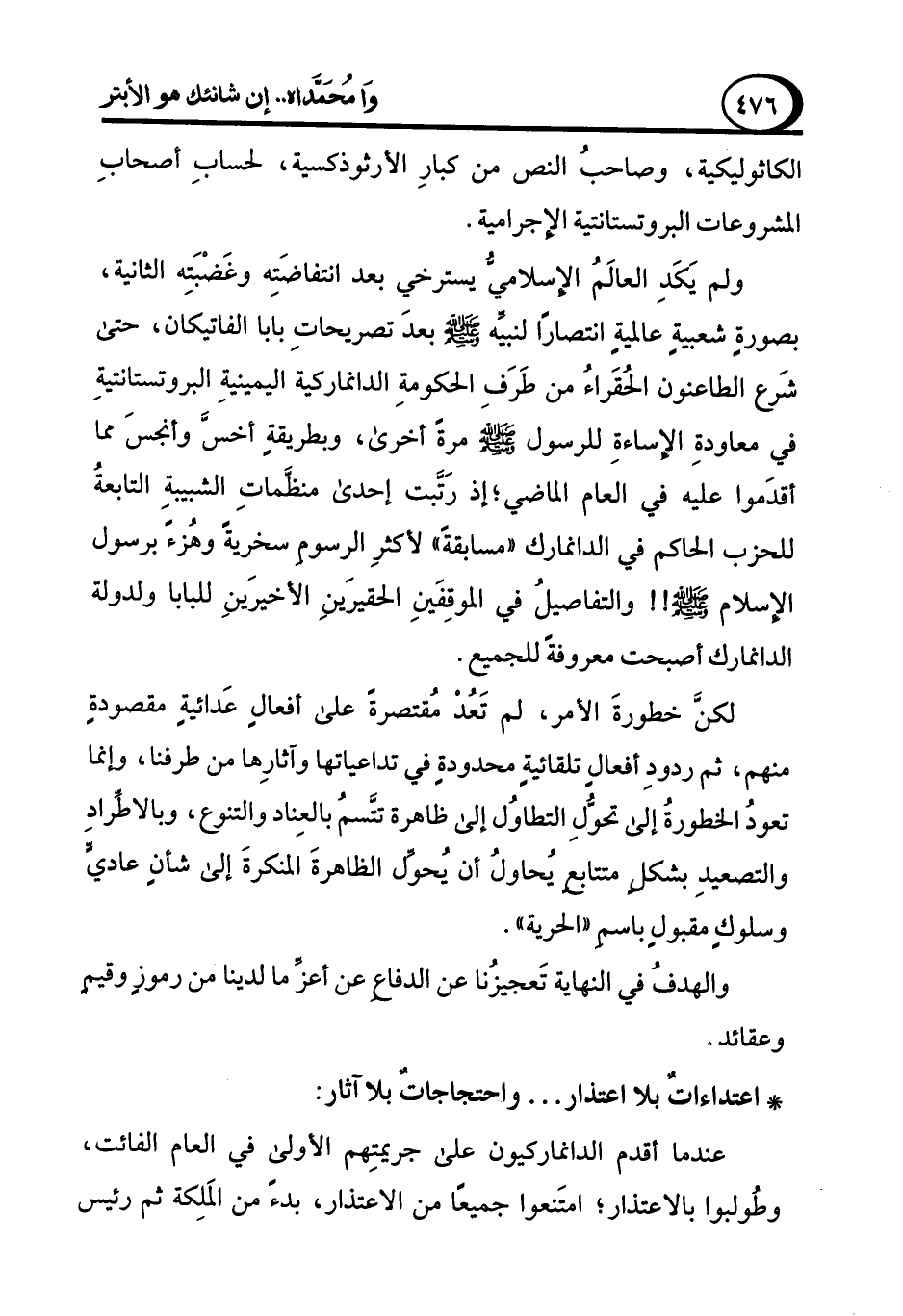 ولم يَكَدِ العالَمُ الإسلاميُّ يسترخي بعد إنتفاضَتِه وغَضْبَتِه الثانية، بصورةٍ شعبيةٍ عالميةٍ انتصارًا لنبيِّه - صلى الله عليه وسلم - بعدَ تصريحاتِ بابا الفاتيكان، حتى شَرع الطاعنون الحُقَراءُ من طَرَفِ الحكومةِ الدانماركية اليمينيةِ البروتستانتيةِ في معاودةِ الإساءةِ للرسول - صلى الله عليه وسلم - مرةً أخرى، وبطريقةٍ أخسَّ وأنجسَ مما أقدَموا عليه في العام الماضي؛ إذ رَتَّبت إحدى منظَماتِ الشبيبةِ التابعةُ للحزب الحاكم في الدانمارك "مسابقةً" لأكثرِ الرسومِ سخريةً وهُزءً برسول الإسلام - صلى الله عليه وسلم -!! والتفاصيلُ في الموقِفَينِ الحقيرَينِ الأخيرَينِ للبابا ولدولة الدانمارك أصبحت معروفةً للجميع.
