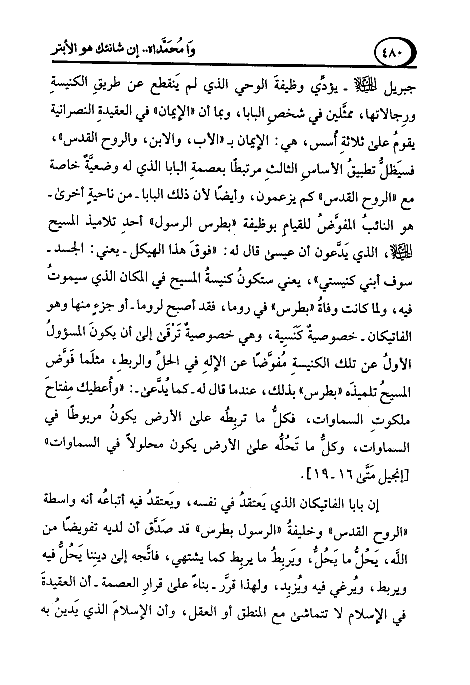 إن بابا الفاتيكان الذي يَعتقدُ في نفسه، ويَعتقدُ فيه أتباعُه أنه واسطة "الروح القدس" وخليفةُ "الرسول بطرس" قد صَدَّق أن لديه تفويضًا من الله، يَحُل ما يَحُل، ويَربِطُ ما يربِط كما يشتهي، فاتَّجه إلى دينِنا يَحُل فيهِ ويربط، ويُرغي فيه ويُزبِد، ولهذا قرر -بناءً على قرارِ العصمة- أن العقيدةَ في الإسلام لا تتماشى مع المنطق أو العقل، وأن الإسلامَ الذي يَدينُ به