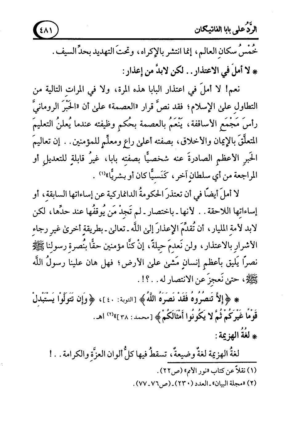 نعم! لا أملَ في اعتذار البابا هذه المرة، ولا في المراتِ التالية من التطاولِ على الإسلام؛ فقد نصَّ قرار "العصمة" على أن "الحَبْرَ الرومانيَّ رأسَ مَجْمَع الأساقفة، يَنْعَمُ بالعصمة بحُكم وظيفته عندما يُعلنُ التعليمَ المتعلَّقَ بالإيمان والأخلاق، بصفته أعلى راعٍ ومعلِّمٍ للمؤمنين .. إن تعاليمَ الحَبرِ الأعظم الصادرةَ عنه شخصيًّا بصفتِه بابا، غيرُ قابلةٍ للتعديل أو المراجعة من أي سلطانٍ آخر، كَنَسِيًّا كان أو بشريًّا" (¬1).