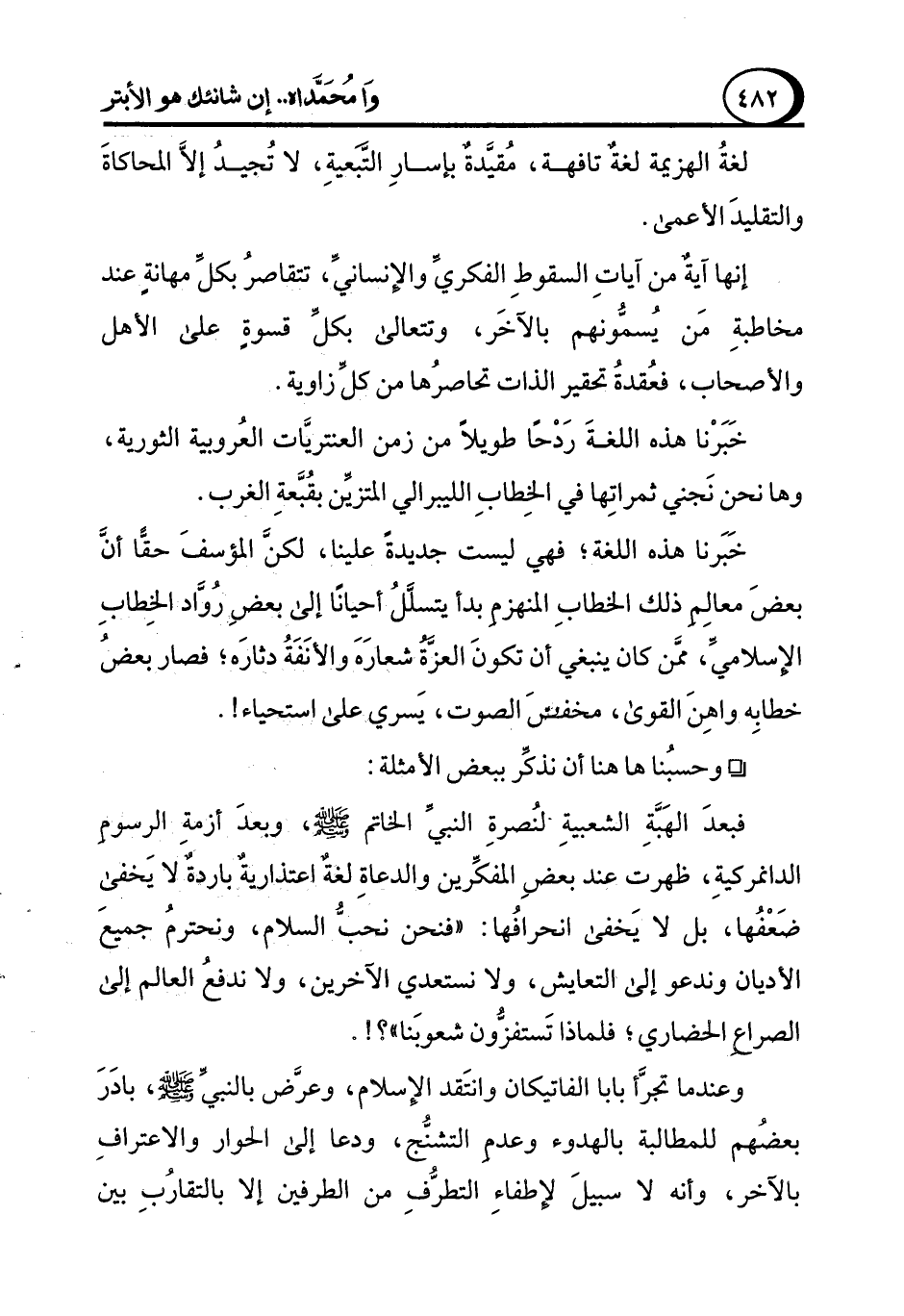 خَبَرنا هذه اللغة؛ فهي ليست جديدةً علينا، لكن المؤسفَ حقًّا أن بعضَ معالِمِ ذلك الخطابِ المنهزمِ بدأ يتسلَّلُ أحيانًا إلى بعضِ رُوَّاد الخِطابِ الإسلاميَّ، ممَّن كان ينبغي أن تكونَ العزَّةُ شعارَهَ والأنَفَة دثارَه؛ فصار بعضُ خطابِه واهِنَ القوى، مخفضَ الصوت، يَسري على استحياء!.