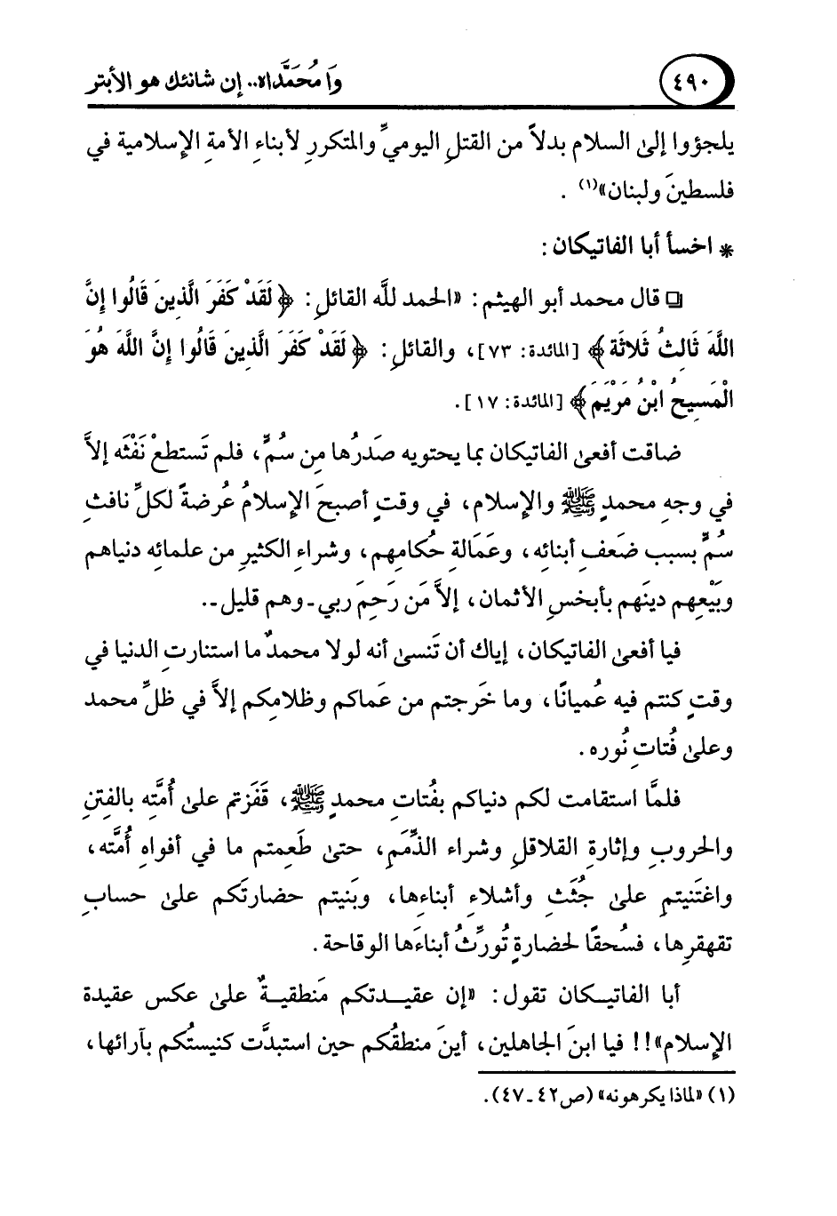 ° قال محمد أبو الهيثم: "الحمد لله القائل: {لَقَدْ كَفَرَ الَذِينَ قَالُوا إِنَّ اللهَ ثَالِثُ ثَلاثَة} [المائدة: 73]، والقائل: {لَقَدْ كَفَرَ الَذِينَ قَالُوا إِنَّ اللهَ هُوَ الْمَسِيح ابْنُ مَرْيَمَ} [المائدة: 17].