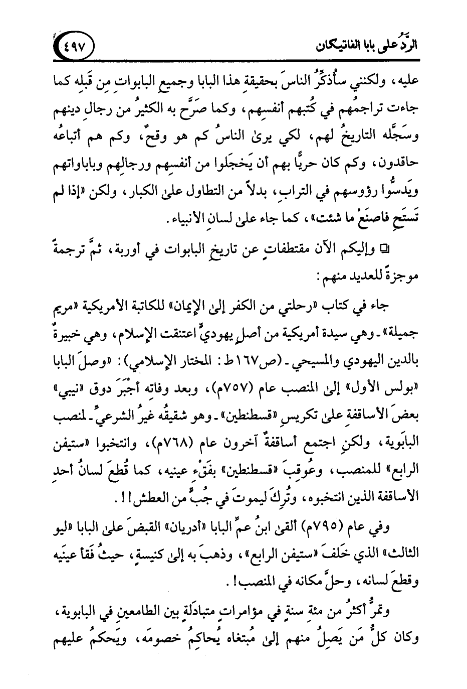 جاء في كتاب "رحلتي من الكفر إلى الإيمان" للكاتبة الأمريكية "مريم جميلة" -وهي سيدة أمريكية من أصلٍ يهودي اعتنقت الإسلام، وهي خبيرةٌ بالدين اليهودي والمسيحي- (ص 167 ط: المختار الإسلامي): "وصلَ البابا "بولس الأول" إلى المنصب عام (757 م)، وبعد وفاتِه أجْبَرَ دوق "نيبي" بعضَ الأساقفةِ على تكريسِ "قسطنطين" -وهو شقيقُه غيرُ الشرعي- لمنصب البابَوية، ولكنِ اجتمع أساقفةٌ آخرون عام (768 م)، وانتخبوا "ستيفن الرابع" للمنصب، وعُوقِبَ "قسطنطين" بفَقْء عينيه، كما قُطعَ لسانُ أحدِ الأساقفة الذين انتخبوه، وتُرِكَ ليموتَ في جُبٍّ من العطش!!.