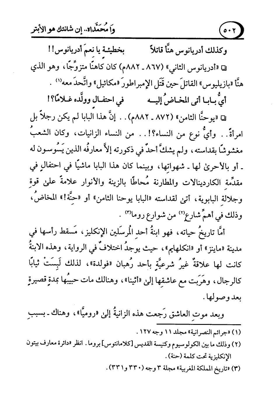 ° "يوحنَّا الثامن" (872 - 882 م) .. إن هذا البابا لم يكن رجلاً بل امرأةً .. وأيُّ نوع من النساء؟! .. من النساء الزانيات، وكان الشعبُ مغشوشًا بقداسته، ولم يشكَّ أحدٌ في ذكررته إلاَّ معارفُه الذين يَسُوسون له -أو بالأحرى لها- شهواتِها، وبينما كان هذا البابا ماشيًا في احتفالٍ في مقدِّمةِ الكاردينالات والمطارنة مُحاطًا بالزينة والأنوار علامةً على قوةِ وجلالةِ البابوية، أتى لقداسته "البابا يوحنا الثامن" أو "حِنَّة! " المخاضُ، وذلك في أهمَّ شارعٍ (¬2) من شوارع روما (¬3).