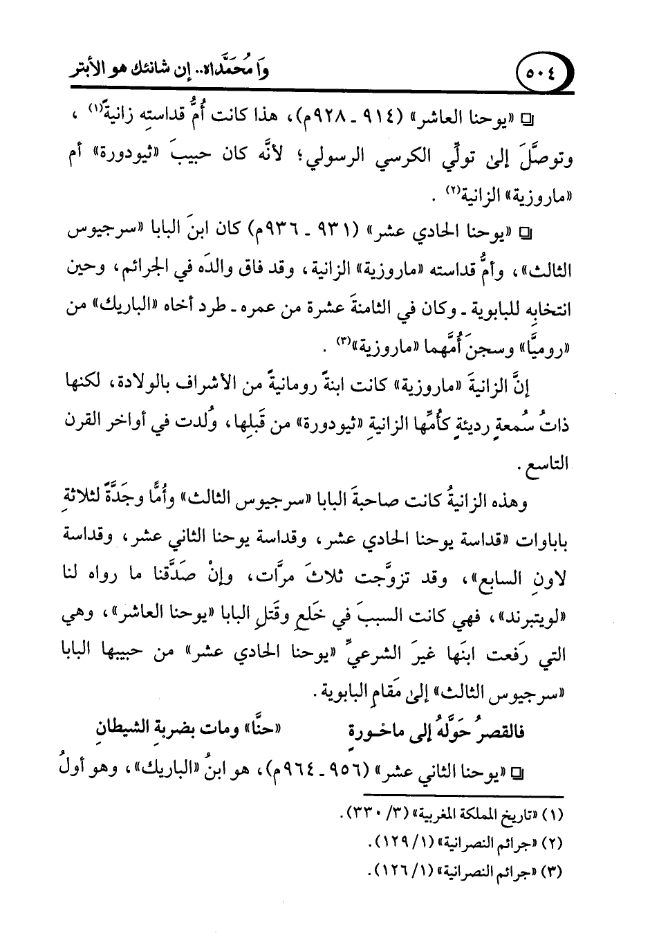 وهذه الزانيةُ كانت صاحبةَ البابا "سرجيوس الثالث" وأمًّا وجَدَّةً لثلاثةِ باباوات "قداسة يوحنا الحادي عشر، وقداسة يوحنا الثاني عشر، وقداسة لاونِ السابع"، وقد تزوَّجت ثلاثَ مرَّات، وإنْ صَدَّقنا ما رواه لنا "لويتبرند"، فهي كانت السببَ في خَلع وقَتل البابا "يوحنا العاشر"، وهي التي رَفعت ابنَها غيرَ الشرعي "يوحنا الحادي عشر" من حبيبها البابا "سرجيوس الثالث" إلى مَقامِ البابوية.