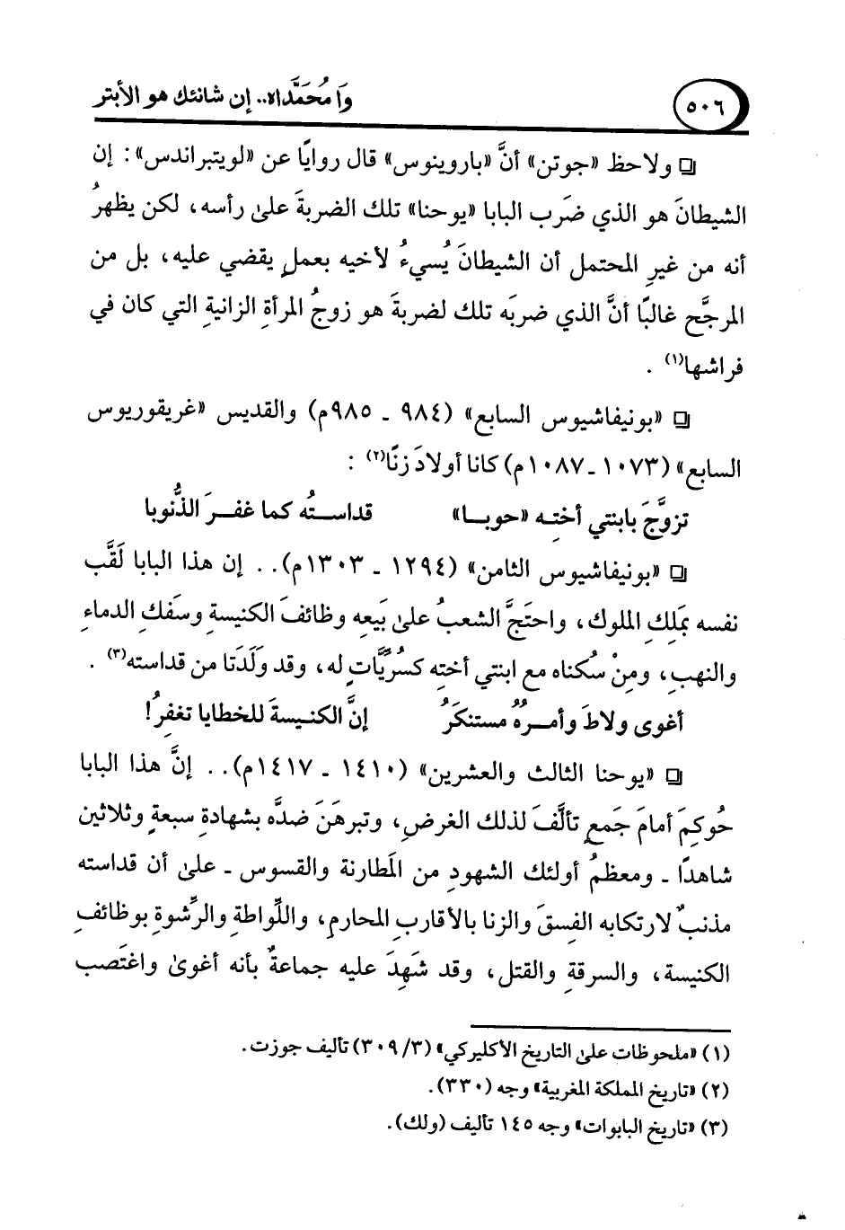 ° "بونيفاشيوس الثامن" (1294 - 1303 م) .. إن هذا البابا لَقَّب نفسه بمَلِكِ الملوك، واحتَجَّ الشعبُ على بَيعِه وظائف الكنيسةِ وسَفكِ الدماءِ والنهبِ، ومِنْ سُكناه مع ابنتي أختِه كسُرِّيَّاتِ له، وقد وَلَدَتا من قداسته (¬3).