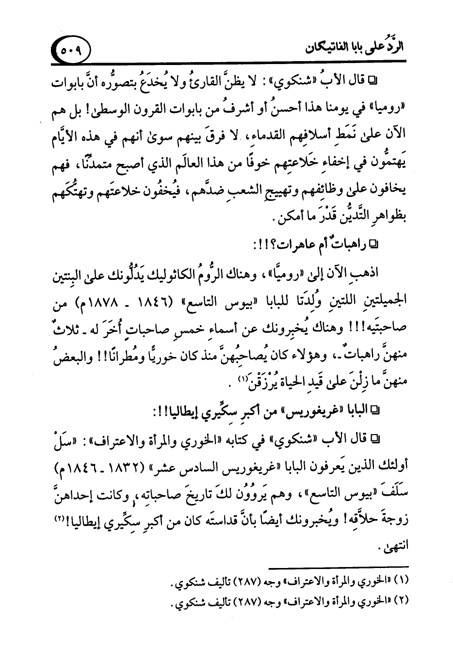 ° قال الأبُ "شنكوي": لا يظنَّ القارئُ ولا يُخدَع بتصوُّره أنَّ بابوات "روميا" في يومنا هذا أحسنُ أو أشرفُ من بابوات القرون الوسطى! بل هم الآن على نَمَطِ أسلافِهم القدماءِ، لا فرقَ بينهم سوى أنهم في هذه الأيام يَهتمُّون في إخفاءِ خَلاعتِهم خوفًا من هذا العالَم الذي أصبح متمدِّنًا، فهم يخافون على وظائِفهم وتهييج الشعبِ ضدَّهم، فيُخفُون خلاعتَهم وتهتكهم بظواهرِ التَّديُّن قَدْرَ ما أمكن.