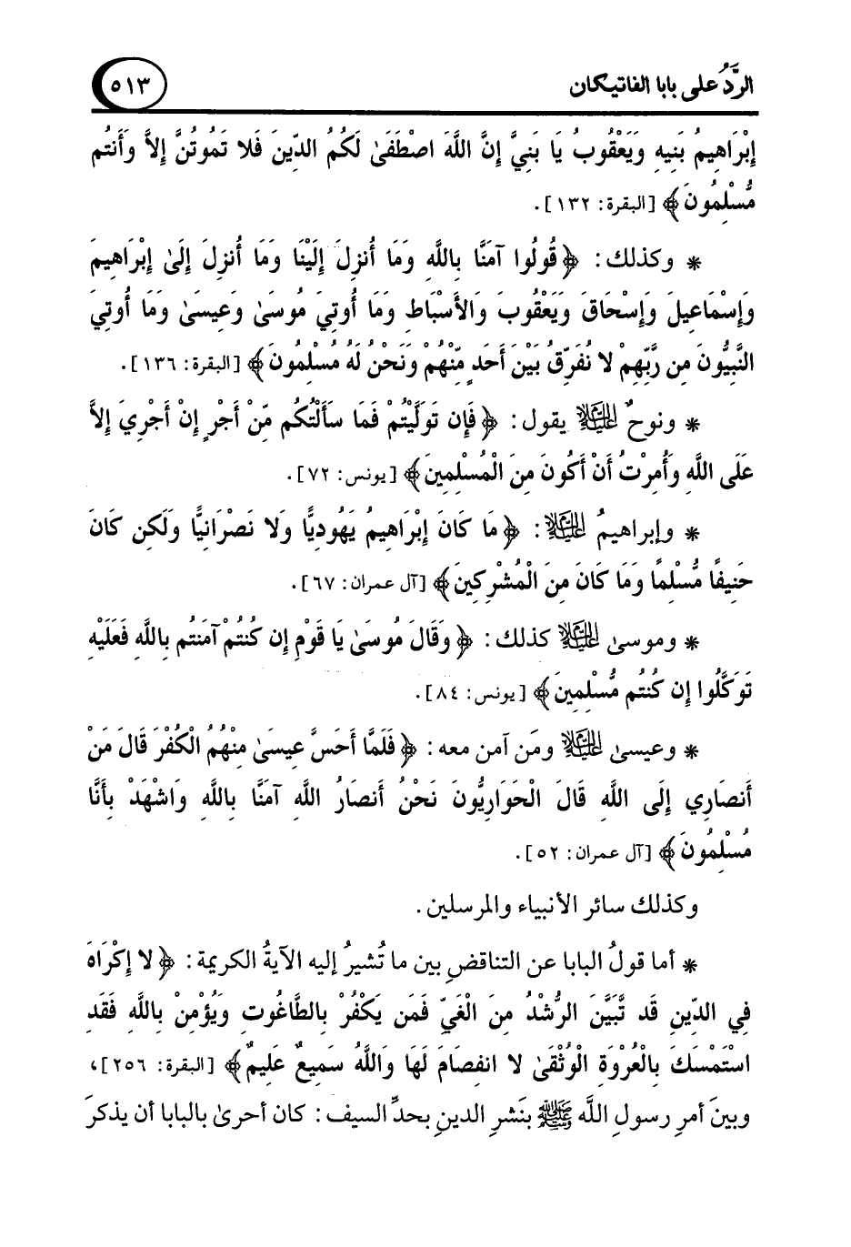 * وإبراهيمُ عليه السلام: {مَا كَانَ إِبْرَاهِيمُ يَهُودِيًّا وَلَا نَصْرَانِيًّا وَلَكِنْ كَانَ حَنِيفًا مُسْلِمًا وَمَا كَانَ مِنَ الْمُشْرِكِينَ (67)} [آل عمران: 67].