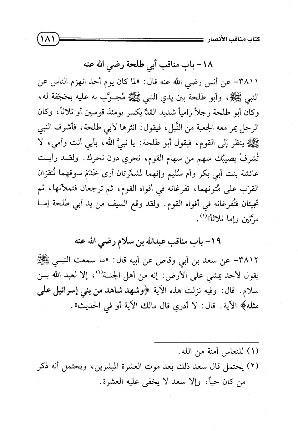 3811 - عن أنس - رضي الله عنه - قال: «لما كان يوم أحد انهزم الناس عن النبي - صلى الله عليه وسلم -، وأبو طلحة بين يدي النبي - صلى الله عليه وسلم - مُجوَّب به عليه بحَجَفة له، وكان أبو طلحة رجلًا راميًا شديد القدِّ يكسر يومئذ قوسين أو ثلاثًا، وكان الرجل يمر معه الجعبة من النَّبل، فيقول: انثرها لأبي طلحة، فأشرف النبي - صلى الله عليه وسلم - ينظر إلى القوم، فيقول أبو طلحة: يا نبيَّ الله، بأبي ان وأمي، لا تُشرفْ يصيبُك سهم من سهام القوم، نحري دون نحرك. ولقد رأيت عائشة بنت أبي بكر وأم سُليم وإنهما لمشمِّرتان أرى خَدَمَ سوقهما تُنقزان القرَب على مُتونهما، تفرغانه في أفواه القوم، ثم ترجعان فتملآنها، ثم تجيئان فتُفرغانه في أفواه القوم. ولقد وقع السيف من يد أبي طلحة إما مرَّتين وإما ثلاثًا» (¬1).