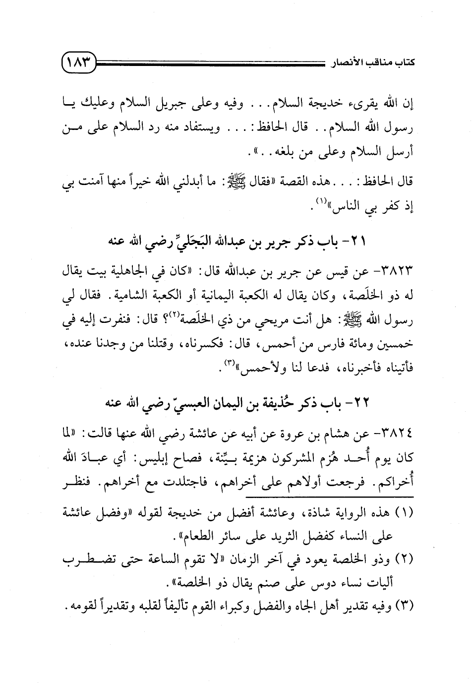 3823 - عن قيس عن جرير بن عبد الله قال: «كان في الجاهلية بيت يقال له ذو الخلَصة، وكان يقال له الكعبة اليمانية أو الكعبة الشامية. فقال لي رسول الله - صلى الله عليه وسلم -: هل أنت مريحي من ذي الخلَصة (¬2)؟ قال: فنفرت إليه في خمسين ومائة فارس من أحمس، قال: فكسرناه، وقتلنا من وجدنا عنده، فأتينا فأخبرناه، فدعا لنا ولأحمس» (¬3).