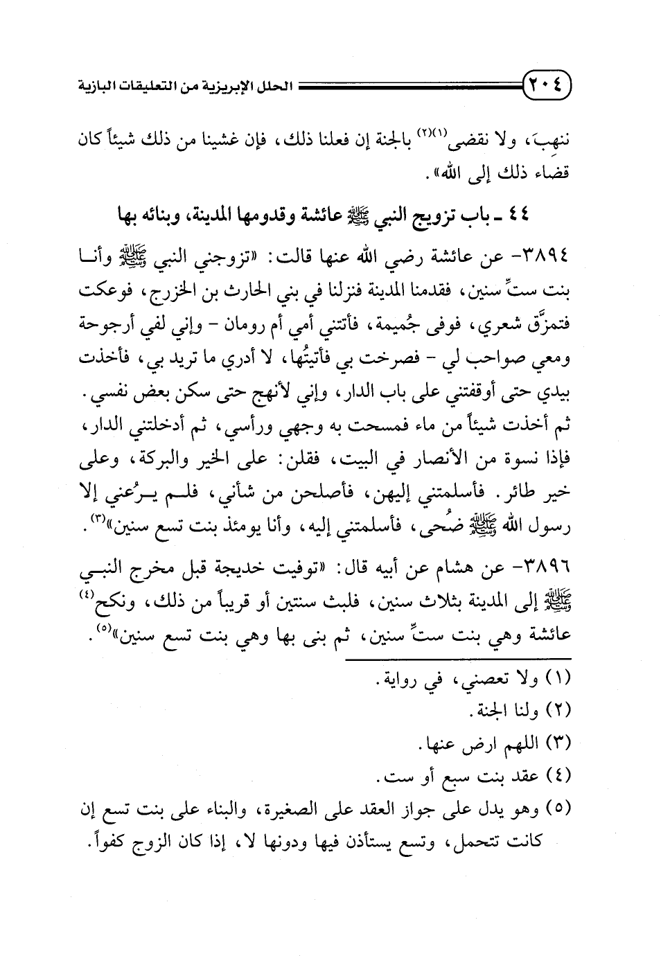 3894 - عن عائشة - رضي الله عنها - قال: «تزوجني النبي - صلى الله عليه وسلم - وأنا بنت ستِّ سنين، فقدمنا المدينة فنزلنا في بني الحارث بن الخزرج، فوعكت فتمزَّق شعري، فوفى جُميمة، فأتتني أمي أم رومان - وإني لفي أرجوحة ومعي صواحب لي - فصرخت بي فأتيتُها، لا أدري ما تريد بي، فأخذت بيدي حتى أوقفتني على باب الدار، وإني لأنهج حتى سكن بعض نفسي. ثم أخذت شيئًا من ماء فمسحت به وجهي ورأسي، ثم أدخلتني الدار، فإذا نسوة من الأنصار في البيت، فقلن: على الخير والبركة، وعلى خير طائر. فأسلمتني إليهن، فأصلحن من شأني، فلم يرُعني إلا رسول الله - صلى الله عليه وسلم - ضُحى، فأسلمتني إليه، وأنا يومئذ بنت تسع سنين» (¬3).