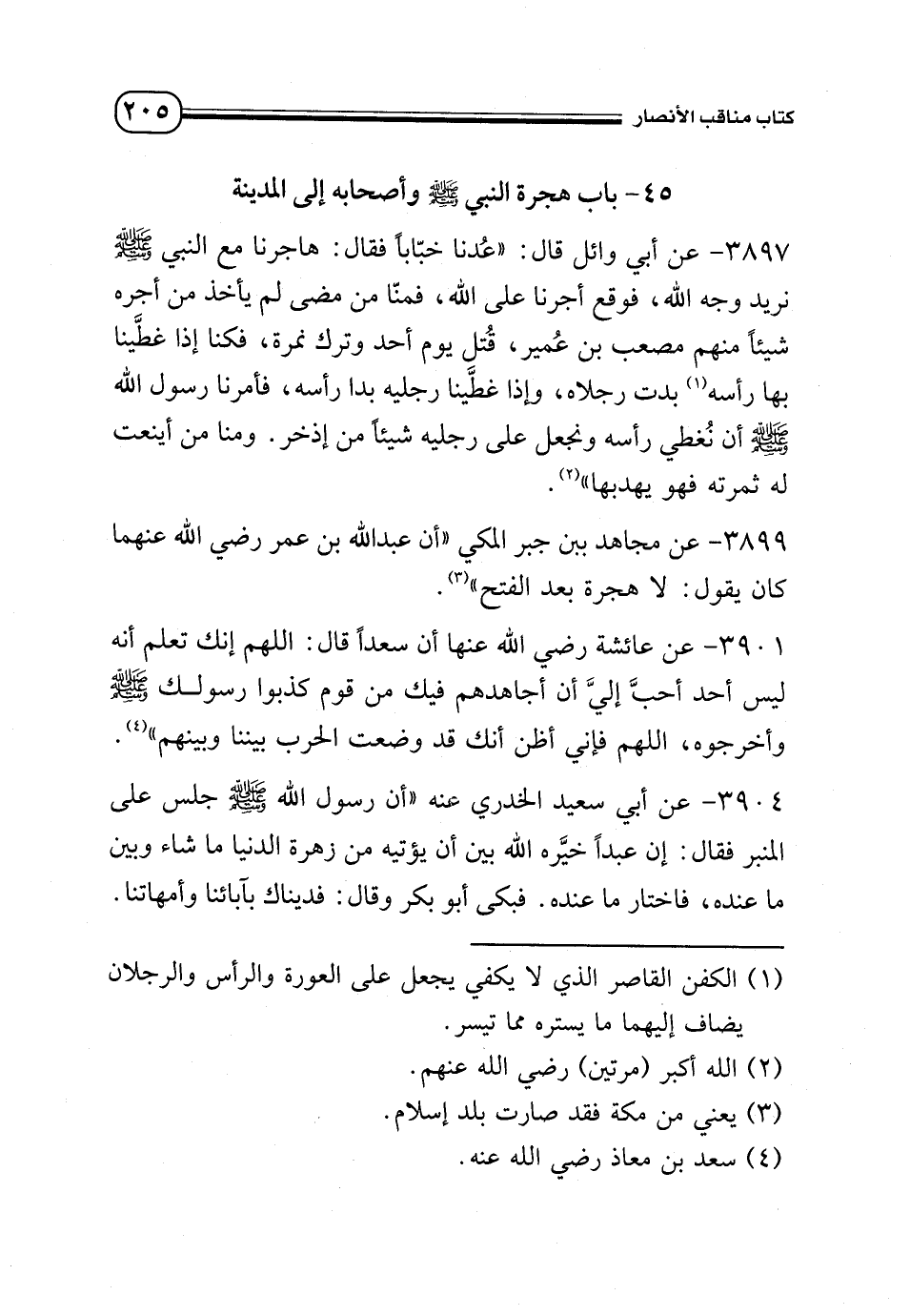 3897 - عن أبي وائل قال: «عُدنا خبّابًا فقال: هاجرنا مع النبي - صلى الله عليه وسلم - نريد وجه الله، فوقع أجرنا على الله، فمنّا من مضى لم يأخذ من أجره شيئًا منهم مصعب بن عُمير، قُتل يوم أحد وترك ونمرة، فكنا إذا غطَّينا بها رأسه (¬1) بدت رجلاه، وإذا غطَّينا رجليه بدا رأسه، فأمرنا رسول الله - صلى الله عليه وسلم - أن نُغطي رأسه ونجعل على رجليه شيئًا من إذخر. ومنا من أينعت له ثمرته فهو يهدبها» (¬2).