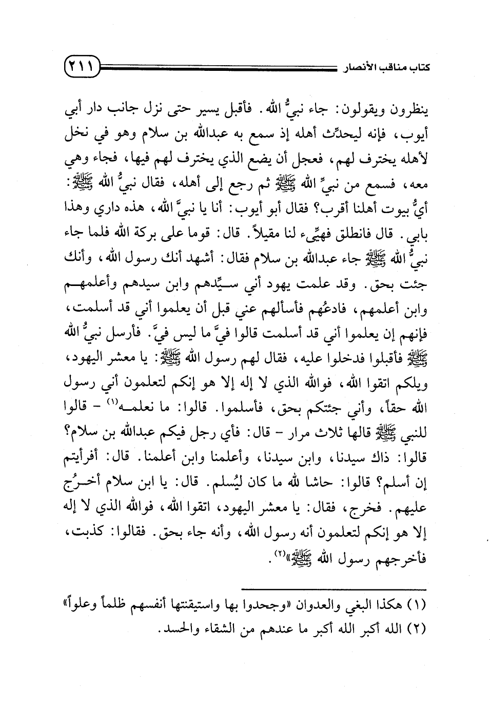 ينظرون ويقولون: جاء نبيُّ الله. فأقبل يسير حتى نزل جانب دار أبي أيوب، فإنه ليحدِّث أهله إذ سمع به عبد الله بن سلام وهو في نخل لأهله يخترف لهم، فعجل أن يضع الذي يخترف لهم فيها، فجاء وهي معه، فسمع من نبيِّ الله - صلى الله عليه وسلم - ثم رجع إلى أهله، فقال نبيُّ الله - صلى الله عليه وسلم - أيُّ بيوت أهلنا أقرب؟ فقال أبو أيوب: أنا يا نبيَّ الله، هذه داري وهذا بابي. قال فانطلق فهيِّئ لنا مقيلًا. قال: قوما على بركة الله فلما جاء نبيُّ الله - صلى الله عليه وسلم - جاء عبد الله بن سلام فقال: أشهد أنك رسول الله، وأنك جئت بحق. وقد علمت يهود أني سيِّدهم وابن سيدهم وأعلمهم وابن أعلمهم، فادعُهم فأسألهم عني قبل أن يعلموا أني قد أسلمت، فإنهم إن يعلموا أني قد أسلمت قالوا فيَّ ما ليس فيَّ. فأرسل نبيُّ الله - صلى الله عليه وسلم - فأقبلوا فدخلوا عليه، فقال لهم رسول الله - صلى الله عليه وسلم -: يا معشر اليهود، ويلكم اتقوا الله، فوالله الذي لا إله إلا هو إنكم لتعلمون أني رسول الله حقًا، وأني جئتكم بحق، فأسلموا. قالوا: ما نعلمه (¬1) - قالوا للنبي - صلى الله عليه وسلم - قالها ثلاث مرار - قال: فأي رجل فيكم عبد الله بن سلام؟ قالوا: ذاك سيدنا، وابن سيدنا، وأعلمنا وابن أعلمنا. قال: أفرأيتم إن أسلم؟ قالوا: حاشا لله ما كان ليُسلم. قال: يا ابن سلام أخرُج عليهم. فخرج، فقال: يا معشر اليهود، اتقوا الله، فوالله الذي لا إله إلا هو إنكم لتعلمون أنه رسول الله، وأنه جاء بحق. فقالوا: كذبت، فأخرجهم رسول الله - صلى الله عليه وسلم -» (¬2).