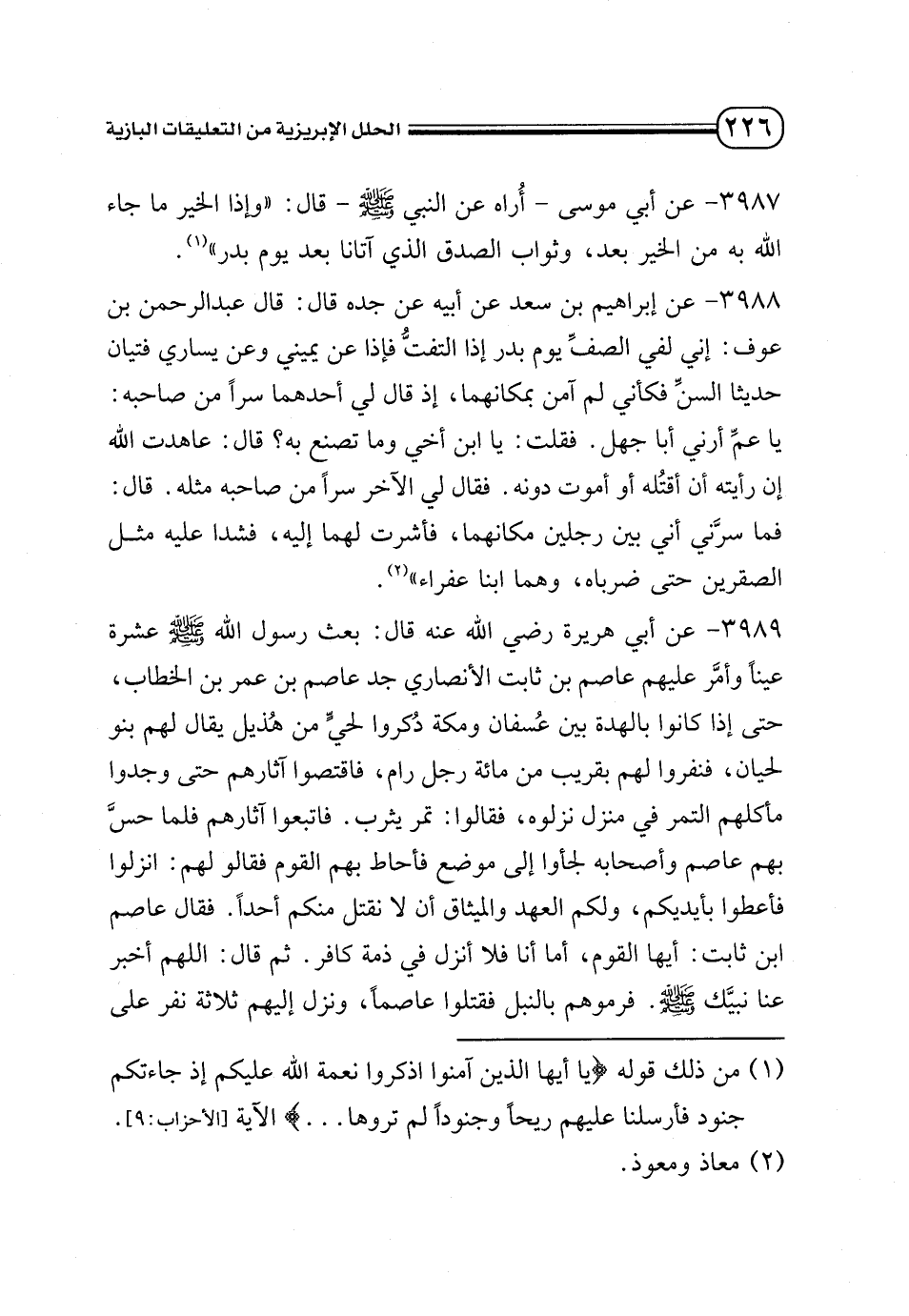 3988 - عن إبراهيم بن سعد عن أبيه عن جده قال: قال عبد الرحمن بن عوف: إني لفي الصفِّ يوم بدر إذا التفتُّ فإذا عن يميني وعن يساري فتيان حديثا السنِّ فكأني لم آمن بمكانهما، إذ قال لي أحدهما سرًا من صاحبه: يا عمِّ أرني أبا جهل. فقلت: يا ابن أخي وما تصنع به؟ قال: عاهدت الله إن رأيته أن أقتُله أو أموت دونه. فقال لي الآخر سرًا من صاحبه مثله. قال: فما سرَّني أني بين رجلين مكانهما، فأشرت لهما إليه، فشدا عليه مثل الصقرين حتى ضرباه، وهما ابنا عفراء» (¬2).