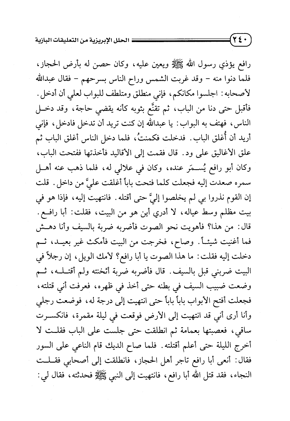 رافع يؤذي رسول الله - صلى الله عليه وسلم - ويعين عليه، وكان حصن له بأرض الحجاز، فلما دنوا منه - وقد غربت الشمس وراح الناس بسرحهم - فقال عبد الله لأصحابه: اجلسوا مكانكم، فإني منطلق ومتلطف للبواب لعلي أن أدخل. فأقبل حتى دنا من الباب، ثم تقنَّع بثوبه كأنه يقضي حاجة، وقد دخل الناس، فهتف به البواب: يا عبد الله إن كنت تريد أن تدخل فادخل، فإني أريد أن أُغلق الباب. فدخلت فكمنتُ، فلما دخل الناس أغلق الباب ثم علق الأغاليق على ود. قال فقمت إلى الأقاليد فأخذتها ففتحت الباب، وكان أبو رافع يُسمَر عنده، وكان في علالي له، فلما ذهب عنه أهل سمره صعدت إليه فجعلت كلما فتحت بابًا أغلقت عليَّ من داخل. قلت إن القوم نذروا بي لم يخلصوا إلىَّ حتى أقتله. فانتهيت إليه، فإذا هو في بيت مظلم وسط عياله، لا أدري أين هو من البيت، فقلت: أبا رافع. قال: من هذا؟ فأهويت نحو الصوت فأضربه ضربة بالسيف وأنا دهش فما أغنيت شيئًا. وصاح، فخرجت من البيت فأمكث غير بعيد، ثم دخلت إليه فقلت: ما هذا الصوت يا أبا رافع؟ لأمك الويل، إن رجلًا في البيت ضربني قبل بالسيف. قال فأضربه ضربة أثخنته ولم أقتله، ثم وضعت ضبيب السيف في بطنه حتى أخذ في ظهره، فعرفت أني قتلته، فجعلت أفتح الأبواب بابًا بابًا حتى انتهيت إلى درجة له، فوضعت رجلي وأنا أرى أني قد انتهيت إلى الأرض فوقعت في ليلة مقمرة، فانكسرت ساقي، فعصبتها بعمامة ثم انطلقت حتى جلست على الباب فقلت لا أخرج الليلة حتى أعلم أقتلته.