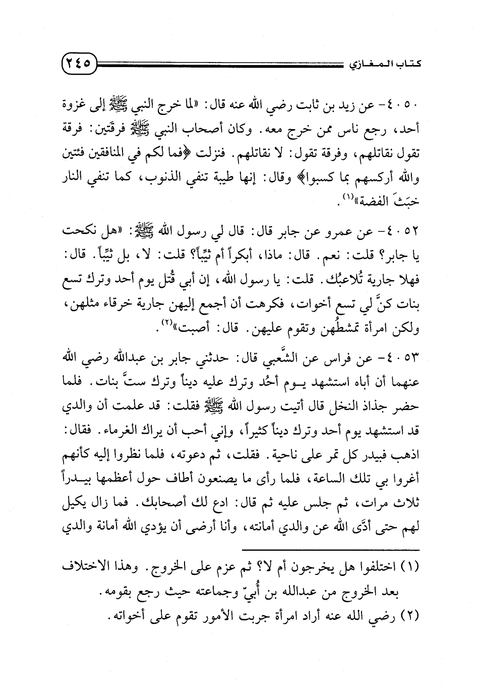 4050 - عن زيد بن ثابت - رضي الله عنه - قال: «لما خرج النبي - صلى الله عليه وسلم - إلى غزو أحد، رجع ناس ممن خرج معه. وكان أصحاب النبي - صلى الله عليه وسلم - فرقَتين: فرقة تقول نقاتلهم، وفرقة تقول: لا نقاتلهم. فنزلت {فَمَا لَكُمْ فِي الْمُنَافِقِينَ فِئَتَيْنِ وَاللَّهُ أَرْكَسَهُمْ بِمَا كَسَبُوا} [النساء: 88] وقال: إنها طيبة تنفي الذنوب، كما تنفي النار خبَثَ الفضة» (¬1).