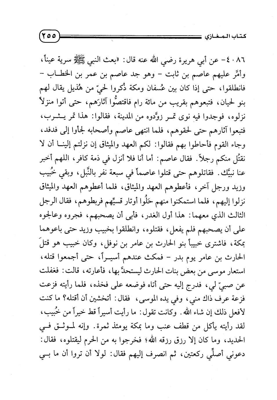 4086 - عن أبي هريرة - رضي الله عنه - قال: «بعث النبي - صلى الله عليه وسلم - سرية عينًا، وأمَّر عليهم عاصم بن ثابت - وهو جد عاصم بن عمر بن الخطاب - فانطلقوا، حتى إذا كان بين عُسفان ومكة ذُكروا لحيّ من هُذيل يقال لهم بنو لحيان، فتبعوهم بقريب من مائة رام فاقتصُّوا آثارَهم، حتى أتوا منزلًا نزلوه، فوجدوا فيه نوى تمر زوَّدوه من المدينة، فقالوا: هذا تمر يثرب، فتبعوا آثارهم حتى لحقوهم، فلما انتهى عاصم وأصحابه لجأوا إلى فدفد، وجاء القوم فأحاطوا بهم فقالوا: لكم العهد والميثاق إن نزلتم إلينا أن لا نقتُل منكم رجلًا. فقال عاصم: أما أنا فلا أنزل في ذمة كافر، اللهم أخبر عنا نبيَّك. فقاتلوهم حتى قتلوا عاصمًا في سبعة نفر بالنَّبل، وبقي خُبيب وزيد ورجل آخر، فأعطوهم العهد والميثاق، فلما أعطوهم العهد والميثاق نزلوا إليهم، فلما استمكنوا منهم حَلُوا أوتار قسيِّهم فربطوهم بها، فقال الرجل الثالث الذي معهما: هذا أول الغدر، فأبى أن يصحبهم فجروه وعالجوه على أن يصحبهم فلم يفعل، فقتلوه، وانطلقوا بخبيب وزيد حتى باعوهما بمكة، فاشترى خبيبًا بنو الحارث بن عامر بن نوفل، وكان خبيب هو قتلَ الحارث يوم بدر - فمكث عندهم أسيرًا، حتى أجمعوا قتله، استعار موسى من بعض بنات الحارث ليستحدَّ بها، فأعارته، قالت: فغفلت عن صبيّ لي، فدرج إليه حتى أتاه فوضعه على فخذه، فلما رأيته فزعت فزعة عرف ذاك مني، وفي يده الموسى، فقال: أتخشين أن أقتله؟ ما كنت لأفعل ذاك إن شاء الله. وكانت تقول: ما رأيت أسيرًا قط خيرًا من خُبيب، لقد رأيته يأكل من قطف عنب وما بمكة يومئذ ثمرة. وإنه لموثق في الحديد، وما كان إلا رزق رزقه الله؛ فخرجوا به من الحرم ليقتلوه، فقال: دعوني أصلِّي ركعتين، ثم انصرف إليهم فقال: لولا أن تروا أن ما بي